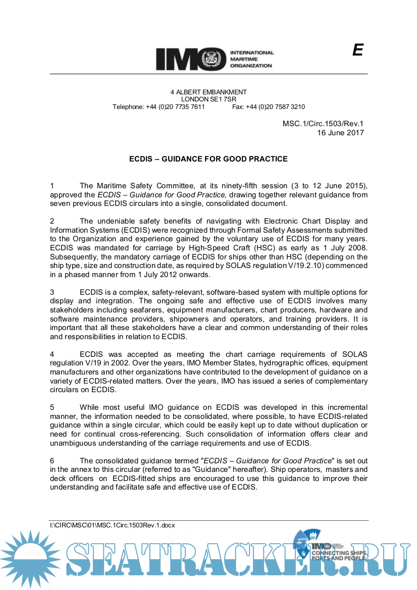 Description: The Maritime Safety Committee, at its ninety-fifth session (3 to 12 June 2015), approved the ECDIS – Guidance for Good Practice, drawing together relevant guidance from seven previous ECDIS circulars into a single, consolidated document.