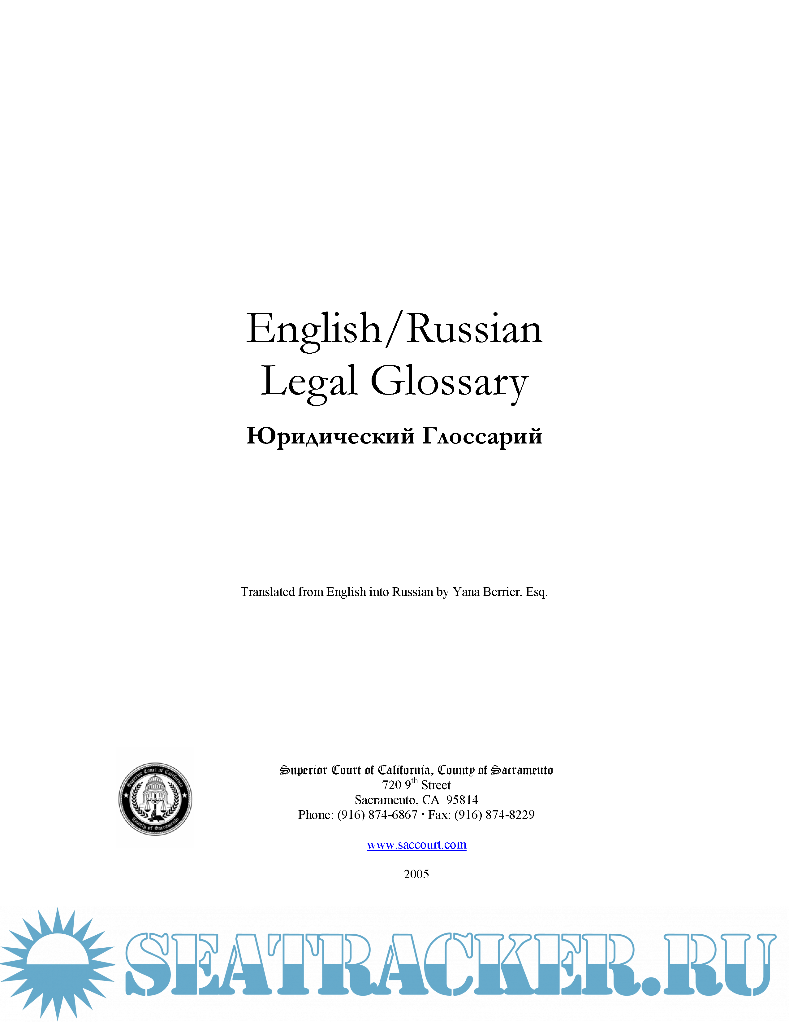 Year: 2005 Language: russian / english Author: Yana Berrier Genre: Handbook Format: PDF Quality: Scanned pages Pages count: 161 Description: English/Russian Legal Glossary Юридический Глоссарий The Superior Court of California, County of Sacramento has prepared this Legal Glossary. This glossary is to be used for general reference purposes only, should be considered a "workin- progress," and is not intended to provide legal advice.