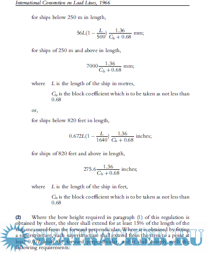 Year: 2005 Language: english Author: IMO Genre: Documentation Publisher: IMO Publication Edition: 2005 electronic edition Format: PDF Quality: eBook Pages count: 243 Description: It has long been recognized that limitations on the draught to which a ship may be loaded make a significant contribution to her safety. These limits are given in the form of freeboards, which constitute, besides external weathertight and watertight integrity, the main objective of the Convention. The first International Convention on Load Lines, adopted in 1930, was based on the principle of reserve buoyancy, although it was recognized then that the freeboard should also ensure adequate stability and avoid excessive stress on the ship's hull as a result of overloading. In the 1966 Load Lines convention, adopted by IMO, provisions are made for determining the freeboard of ships by subdivision and damage stability calculations. The regulations take into account the potential hazards present in different zones and different seasons. The technical annex contains several additional safety measures concerning doors, freeing ports, hatchways and other items. The main purpose of these measures is to ensure the watertight integrity of ships' hulls below the freeboard deck. All assigned load lines must be marked amidships on each side of the ship, together with the deck line. Ships intended for the carriage of timber deck cargo are assigned a smaller freeboard as the deck cargo provides protection against the impact of waves The Convention includes three annexes. Annex I is divided into four Chapters: Chapter I - General; Chapter II - Conditions of assignment of freeboard; Chapter III - Freeboards; Chapter IV - Special requirements for ships assigned timber freeboards. Annex II covers Zones, areas and seasonal periods. Annex III contains certificates, including the International Load Line Certificate.