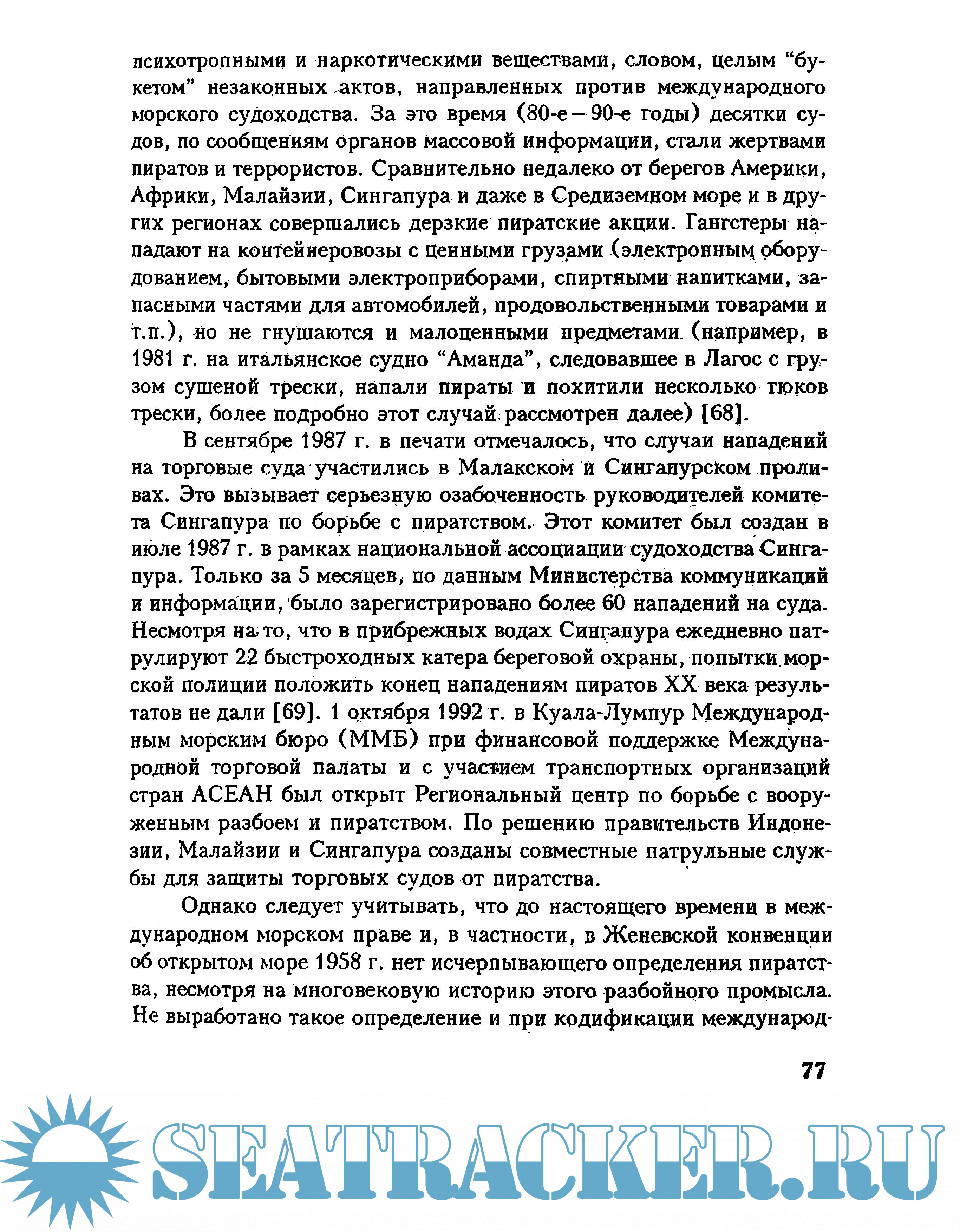 Год выпуска: 1997 Язык: Русский, Английский Автор: Демиденко В.В., Прусс В.М. и др. Жанр: Учебное пособие Издательство: АО БАХВА Издание: 2-е ISBN: 966-7079-13-9 Формат: DjVu Качество: Отсканированные страницы + слой распознанного текста Количество страниц: 139 Описание: В книге содержатся исторические сведения о развитии пиратства, терроризма, мошенничества на море и о борьбе с этими и другими незаконными актами, направленными против безопасности мореплавания. Для курсантов, студентов морских и юридических учебных заведений, командного состава морских судов, работников эксплуатационных служб судовладельческих организаций, профессорско-преподавательского состава и научных работников, представляет интерес для всех, кто связан с торговым мореплаванием. Печатается по решению Ученого совета Одесской государственной морской академии.
