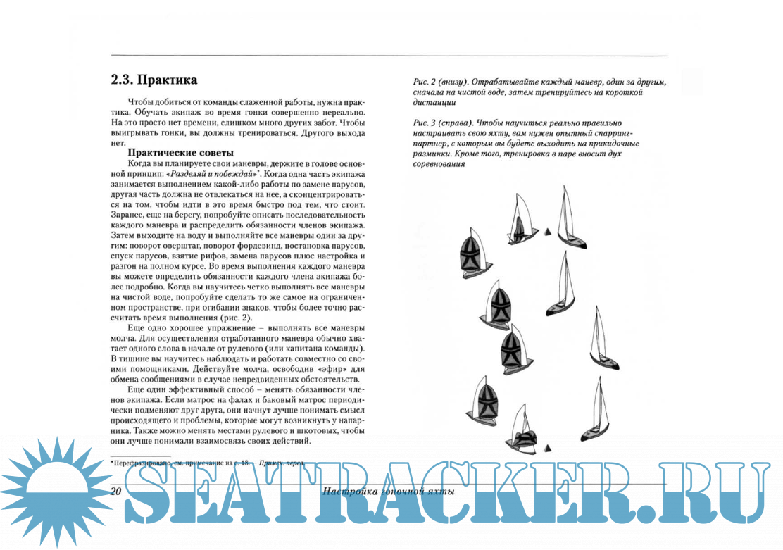 «Даже если вы тактический гений, вам нужна команда экспертов для настройки яхты и ее разгона до максимальной скорости, – пишет автор. – Если же вы гоняетесь в одиночку, вам приходится стать «командой экспертов» самому». Гладстоун рассказывает, как собирать и тренировать экипаж, знакомит читателя со специфическими приемами управления яхтой в лавировку и на попутных курсах, включая работу со спинакером, как традиционным, так и асимметричным.