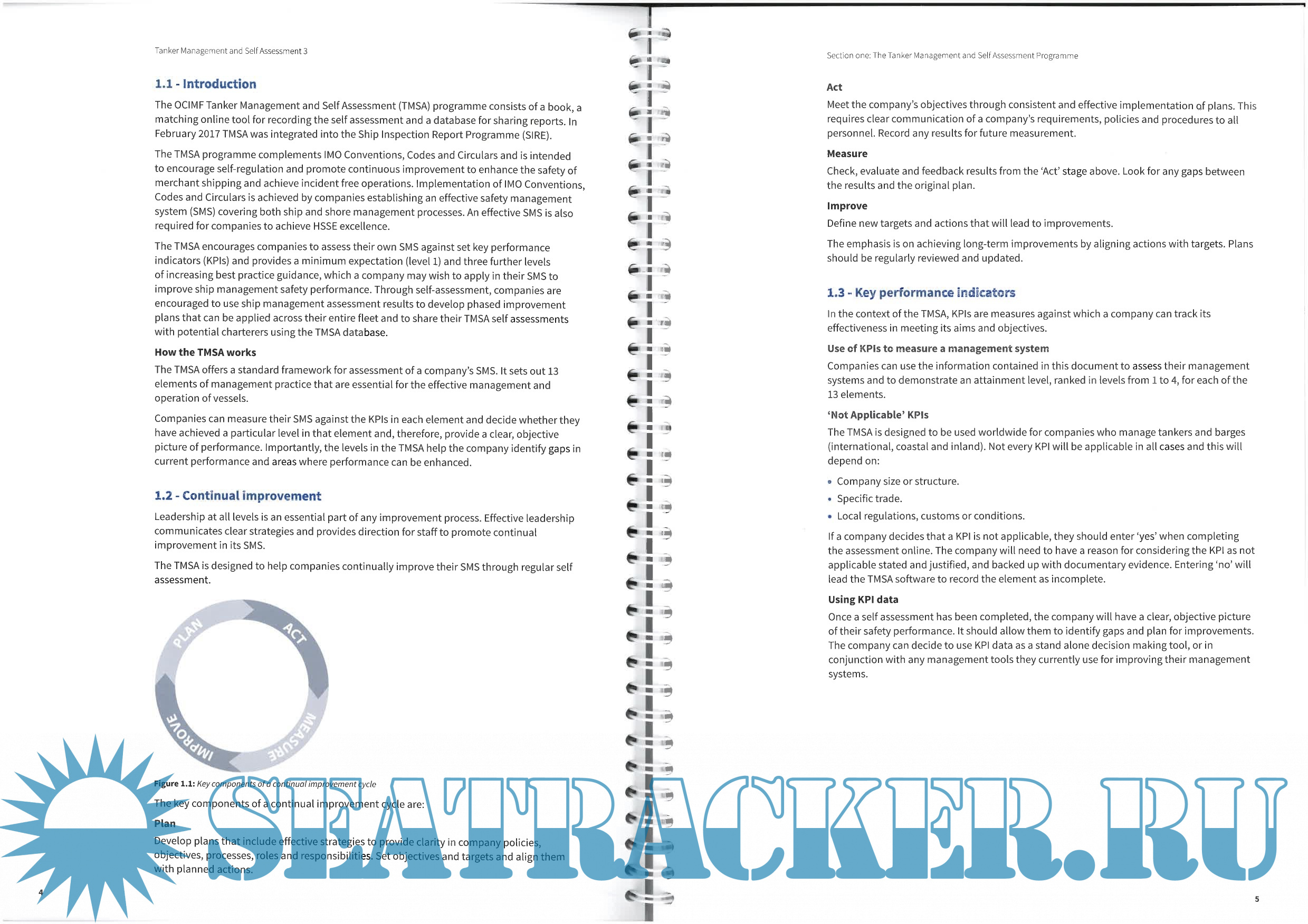 The TMSA encourages companies to assess their own SMS against set key performance indicators (KPIs) and provides a minimum expectation (level 1) and three further levels of increasing best practice guidance, which a company may wish to apply in their SMS to improve ship management safety performance. Through self-assessment, companies are encouraged to use ship management assessment results to develop phased improvement plans that can be applied across their entire fleet and to share their TMSA self assessments with potential charterers using the TMSA database.