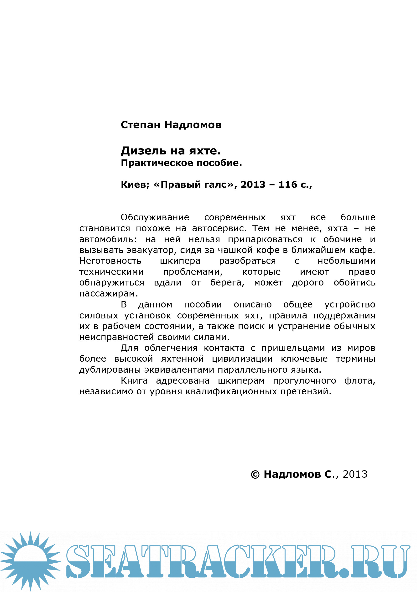 Год выпуска: 2013 Язык: русский Автор: Надломов С. Жанр: Учебное пособие Издательство: Правый галс ISBN: :( Формат: PDF Качество: Изначально компьютерное (eBook) Количество страниц: 116 Описание: Обслуживание современных яхт все больше становится похоже на автосервис. Тем не менее, яхта - не автомобиль: на ней нельзя припарковаться к обочине и вызывать эвакуатор, сидя за чашкой кофе в ближайшем кафе. Неготовность шкипера разобраться с небольшими техническими проблемами, которые имеют право обнаружиться вдали от берега, может дорого обойтись пассажирам. В данном пособии описано общее устройство силовых установок современных яхт, правила поддержания их в рабочем состоянии, а также поиск и устранение обычных неисправностей своими силами. Для облегчения контакта с пришельцами из миров более высокой яхтенной цивилизации ключевые термины дублированы эквивалентами параллельного языка. Книга адресована шкиперам прогулочного флота, независимо от уровня квалификационных претензий. Доп. информация: And One more "One more shpargalka" :) Алсо см.: