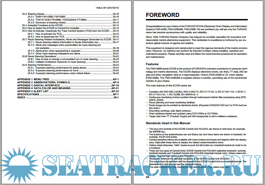 Year: 2015 Language: english Author: Furuno Genre: Manual Publisher: Furuno Edition: ? ISBN: ? Format: PDF Quality: eBook Pages count: 432 Description: Congratulations on your choice of the FURUNO ECDIS (Electronic Chart Display and Information System) FMD-3200, FMD-3200-BB, FMD-3300. We are confident you will see why the FURUNO name has become synonymous with quality and reliability. Since 1948, FURUNO Electric Company has enjoyed an enviable reputation for innovative and dependable marine electronics equipment. This dedication to excellence is furthered by our extensive global network of agents and dealers. This equipment is designed and constructed to meet the rigorous demands of the marine environment. However, no machine can perform its intended function unless installed, operated and maintained properly. Please carefully read and follow the recommended procedures for operation and maintenance. The FMD-3000 series ECDIS is the product of FURUNO’s extensive experience in computer technology and marine electronics. The ECDIS displays electronic charts, nav lines, TT data, AIS targets and other navigation data on a high-resolution 19-inch (FMD-3200) or 23.1-inch display (FMD-3300). The FMD-3200-BB is supplied without a monitor, permitting use of the commercial monitor of your choice.