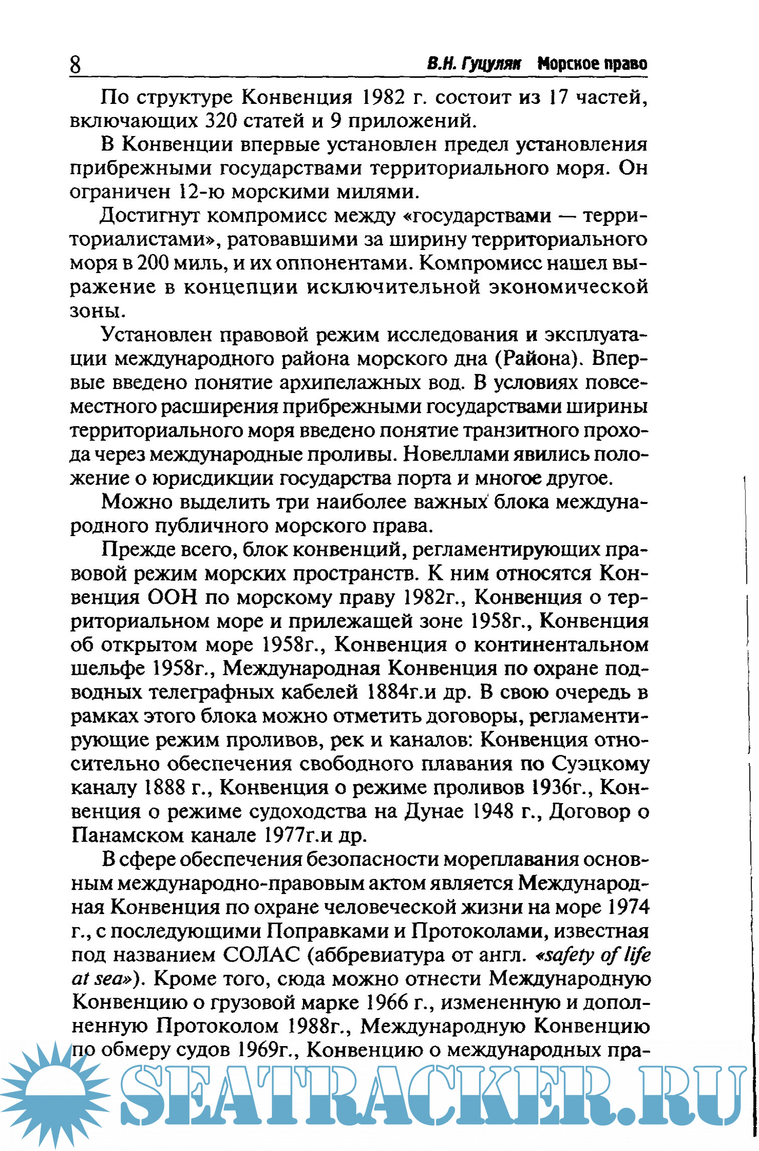 ---Год выпуска: 2000 Язык: русский Автор: Гуцуляк В.Н Жанр: Учебное пособие Издательство: РосКонсульт Формат: DJVU/DOC/PDF Качество: сканы страниц, текстовый документ, сканы страниц Количество страниц: 320 Книга рассчитана на самый широкий круг читателей — как для использования в учебном процессе преподавателями и студентами транспортных, юридических и морских вузов, так и практическими работниками морской отрасли (капитанами морских судов; командным составом морского флота; береговым персоналом, обеспечивающим работу морского транспорта; управленцами различного уровня в государственных и коммерческих морских структурах и т.д.), а также офицерами Военно-Морского Флота России. Изучение курса морского права имеет особое значение для моряков. Знание ими основных принципов морского права, положений российского морского законодательства, международных морских конвенций весьма важно как с точки зрения обеспечения безопасности мореплавания и охраны морской среды, так и в связи с необходимостью иметь целостное представление о возможностях правовой защиты имущественных интересов судовладельца. В соответствии с Конвенцией о подготовке и дипломировании моряков и несении вахты 1978 г., измененной Конференцией 1995 г. (ПДМНВ-78/95), морское право отнесено к дисциплинам, без знания которой лицам командного состава морских судов не может быть выдан соответствующий рабочий диплом.