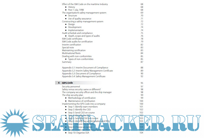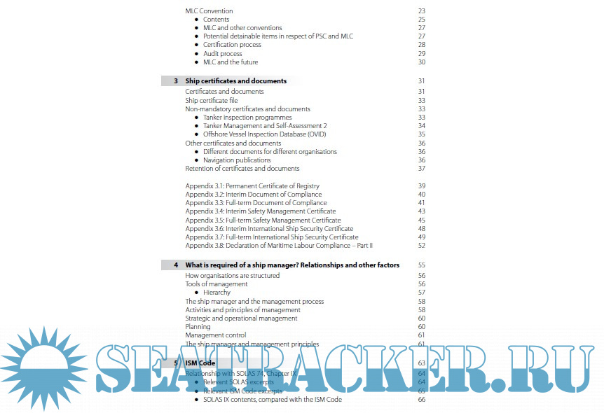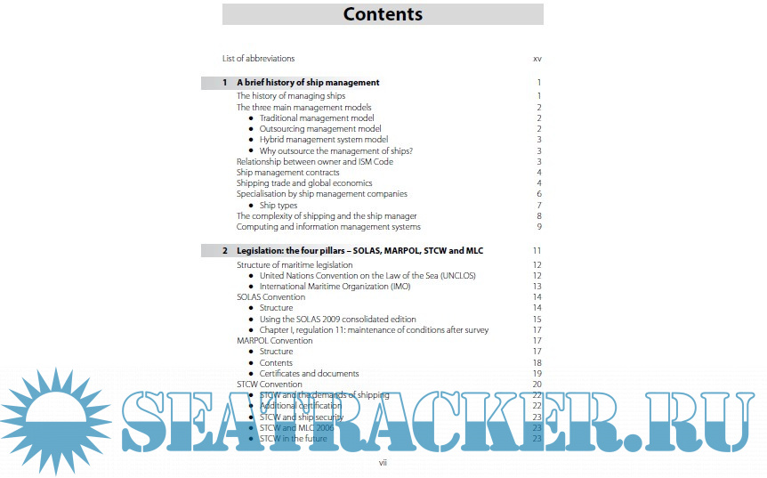 1 A brief history of ship management 2 Legislation: the four pillars – SOLAS, MARPOL, STCW and MLC 3 Ship certificates and documents 4 What is required of a ship manager? Relationships and other factors 5 ISM Code 6 ISPS Code 7 Port state control 8 Third-party inspections 9 Working as part of a team 10 Job descriptions 11 An introduction to commercial ship practices 12 Operational management and ship types 13 Fatigue at sea and in the office 14 Emergency response and the role of the ship manager 15 Effective communications 16 Introduction to chartering and marine insurance 17 Budgets and statistics 18 Relations between ship manager, master, CSO and designated person
