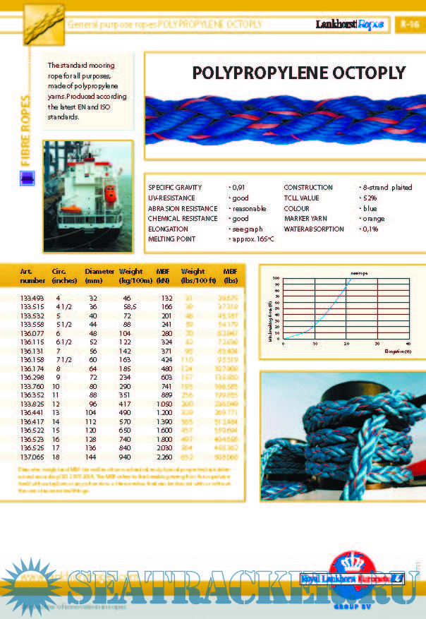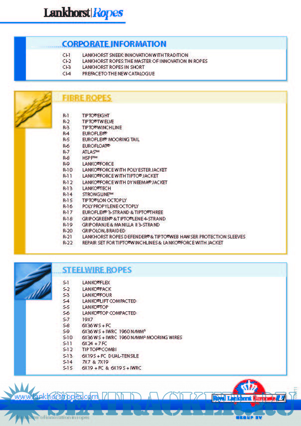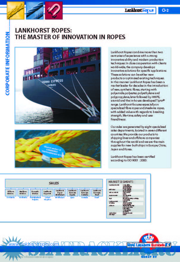 Description: Lankhorst Ropes combine more than two centuries of experience with a strong innovative ability and modern production techniques. In close cooperation with clients world-wide, the company develops innovative solutions for specific applications. These solutions can be either new products or optimized existing techniques. In this manner Lankhorst Ropes has been a market leader for decades in the introduction of new, synthetic fibres, starting with polyamide, polyester, polyethylene and polypropylene, later followed by HMPE, aramid and the in-house developed Tipto® range. Lankhorst focuses especially on specialized fibre ropes and steelwire ropes, with added value with regards to breaking strength, life-time, safety and user friendliness.