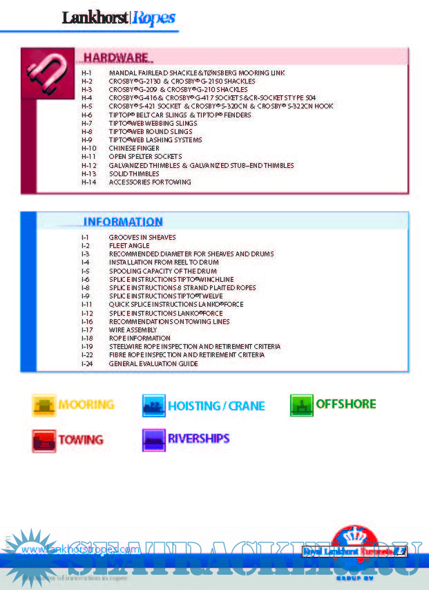 Year: 2009 Language: english Author: Maritime Division Genre: Catalogue Publisher: Lankhorst Euronete Group Format: PDF Quality: eBook Pages count: 94 Description: Lankhorst Ropes combine more than two centuries of experience with a strong innovative ability and modern production techniques. In close cooperation with clients world-wide, the company develops innovative solutions for specific applications. These solutions can be either new products or optimized existing techniques. In this manner Lankhorst Ropes has been a market leader for decades in the introduction of new, synthetic fibres, starting with polyamide, polyester, polyethylene and polypropylene, later followed by HMPE, aramid and the in-house developed Tipto® range. Lankhorst focuses especially on specialized fibre ropes and steelwire ropes, with added value with regards to breaking strength, life-time, safety and user friendliness.