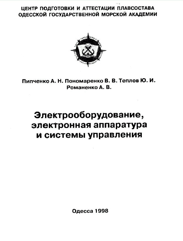 Описание: Пипченко А.Н., Пономаренко ‘В.В., Теплов Ю.И., Романенко А.В. “Электрооборудование, электронная аппаратура и системы управления (учебное пособие в Правилах Регистра и технической эксплуатации) к разделам А-Ш/1, А-Ш/2 8ТС\Л/-ССЮЕ 78/95”. Учебное пособие. Одесса: ЦПАП,-1998.- 295 стр.