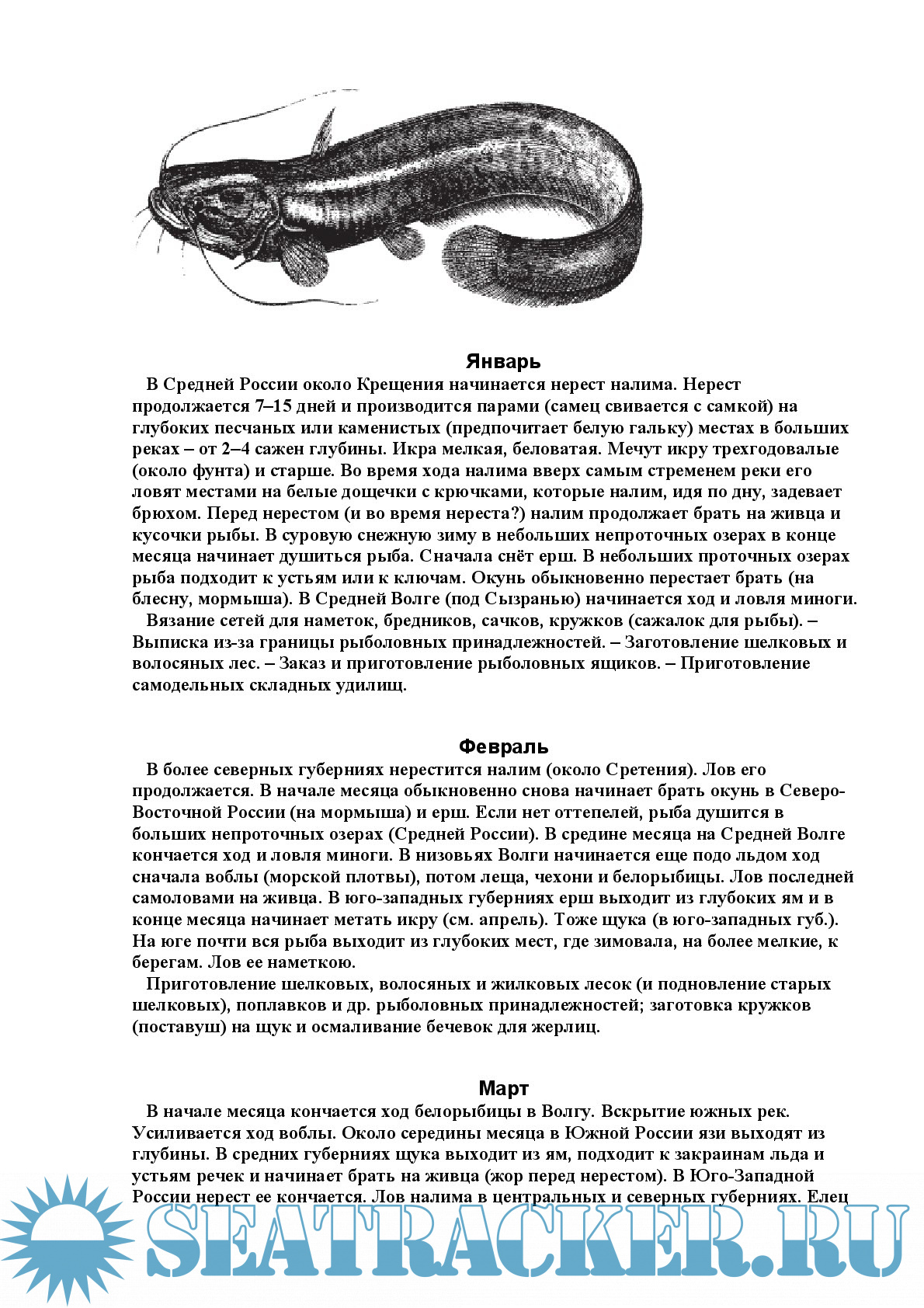 Первую часть издания занимает "Рыболовный календарь", который был впервые опубликован в 1885 г Здесь публикуется полный текст "Рыболовного календаря" в том виде, в каком его подготовил сам Л.П.Сабанеев.