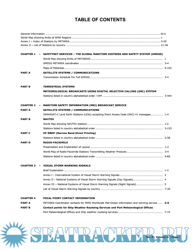 General Information World Map showing limits of WMO Regions Annex I – Index of Stations by METAREA Annex II – List of Stations by country CHAPTER 1 – SAFETYNET SERVICES – THE GLOBAL MARITIME DISTRESS AND SAFETY SYSTEM (GMDSS) - PART A SATELLITE SYSTEMS / COMMUNICATIONS - PART B TERRESTRIAL SYSTEMS METEOROLOGICAL BROADCASTS USING DIGITAL SELECTIVE CALLING (DSC) SYSTEM CHAPTER 2 – MARITIME SAFETY INFORMATION (MSI) BROADCAST SERVICE - PART A SATELLITE SYSTEMS / COMMUNICATIONS - PART B NAVTEX - PART C HF NBDP (Narrow Band Direct Printing) - PART D RADIO-FACSIMILE CHAPTER 3 – VISUAL STORM WARNING SIGNALS CHAPTER 4 FOCAL POINT CONTACT INFORMATION - PART A METAREA Coordinator contacts for WMO Worldwide Met-Ocean information and warning service - PART B Contact points for Ship Weather Routeing Services and Port Meteorological Offices