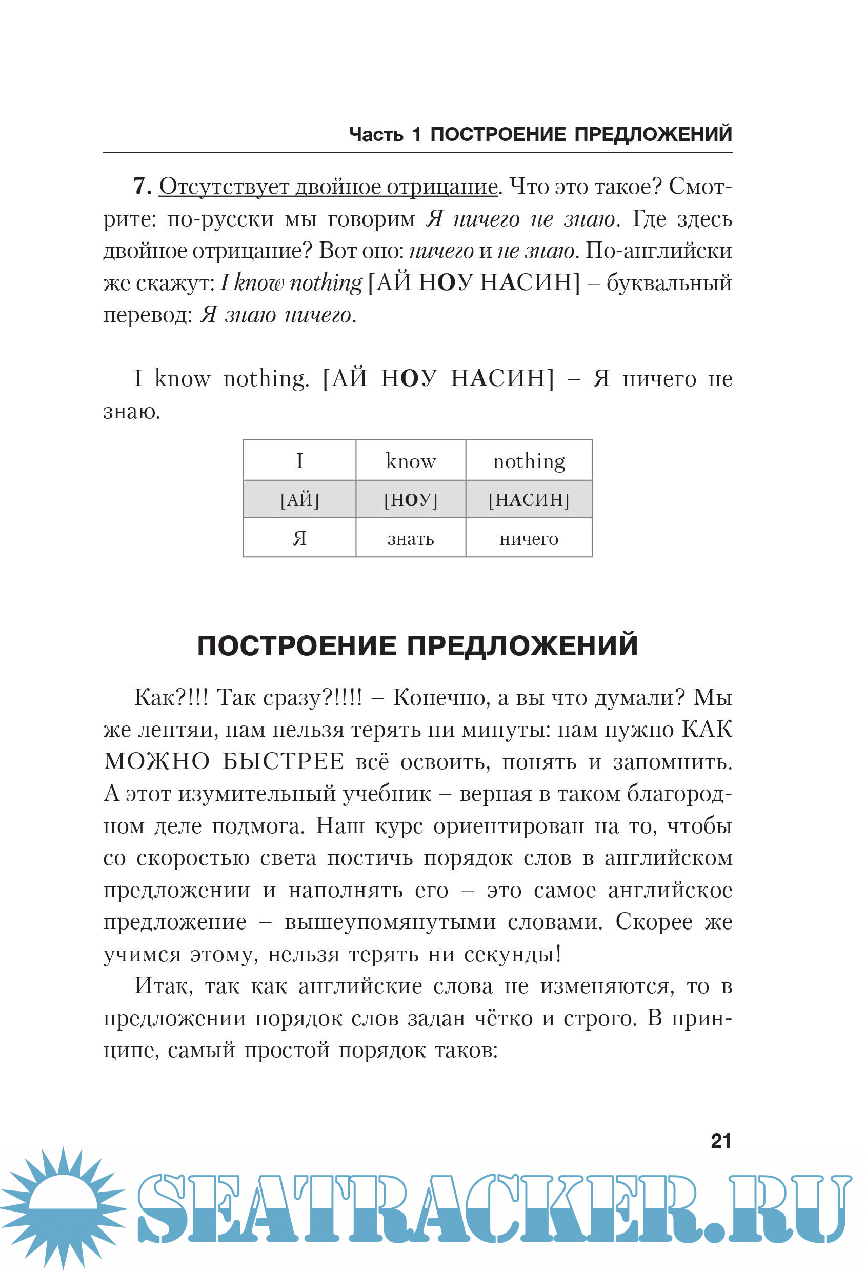 Предисловие 3 Про транскрипцию 5 Часть 1 7 Алфавит 9 Открытый и закрытый слоги 10 Немного о фонетике 12 Местоимения 16 Принципиальные отличия английского языка от русского 17 Построение предложений 21 Подлежащее 23 Определение 28 Сказуемое 50 Дополнение 138 Обстоятельство 143 Часть II. Три группы самых нужных слов 147 100 самых нужных слов 150 200 самых нужных слов 176 500 самых нужных слов 192 Часть III. Парадигмы самых употребительных глаголов 209 Часть IV. Англо-русский словарь для лентяев 319