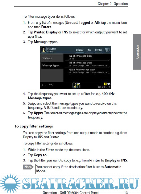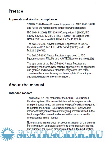 Year: 2015 Language: english Author: Thrane & Thrane A/S Genre: Manual Format: PDF/EPUB Quality: eBook Pages count: 56 Description: This manual is a user manual for the SAILOR 6390 Navtex Receiver system. This manual is intended for anyone who is using or intends to use this system. No specific skills are required to operate the SAILOR 6390 Navtex Receiver. However, it is important that you observe all safety requirements listed in the beginning of this manual, and operate the system according to the guidelines in this manual. Note that this manual does not cover installation of the system. For information on installation refer to the installation manual. Part numbers for related manuals are listed in the next section.