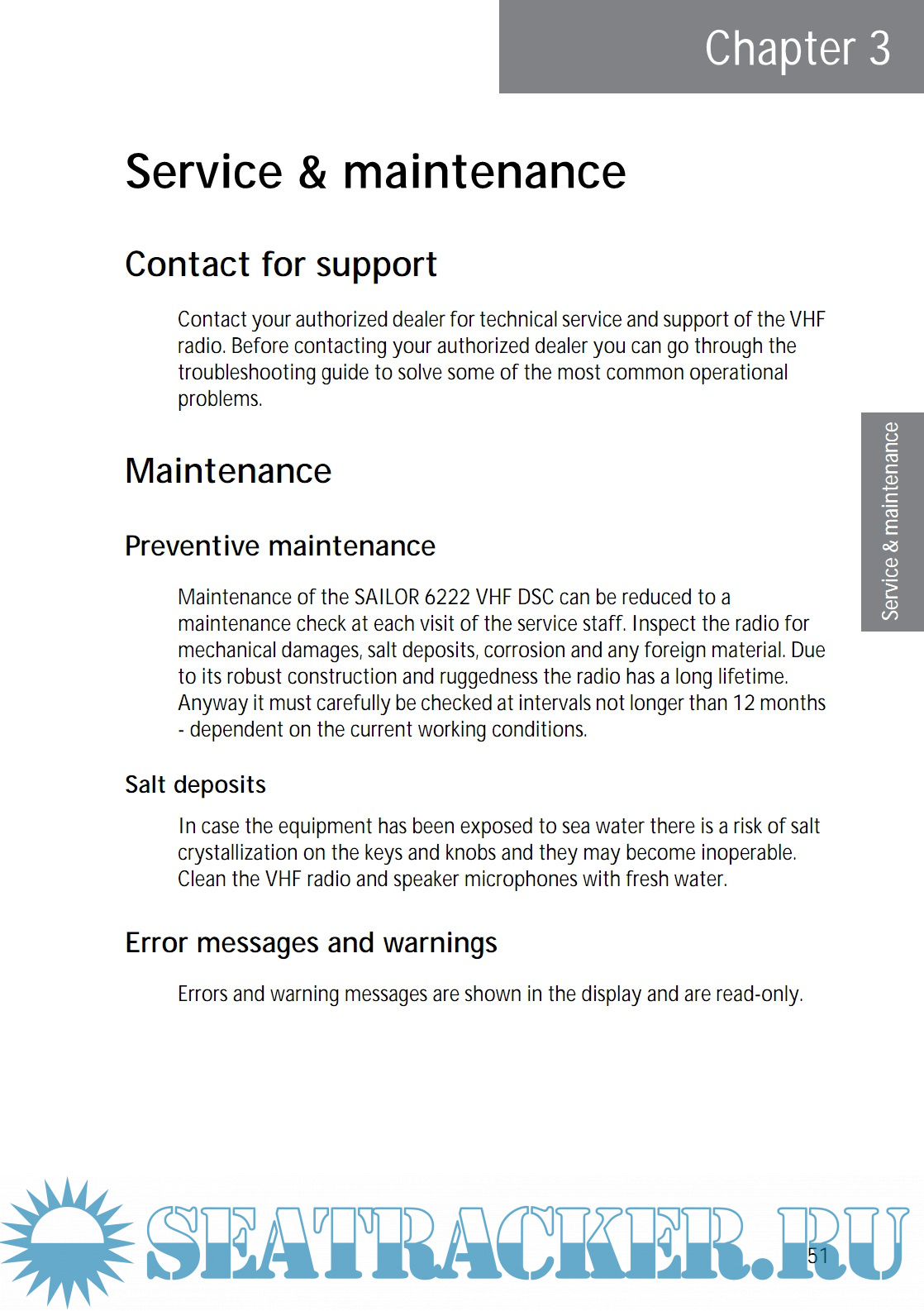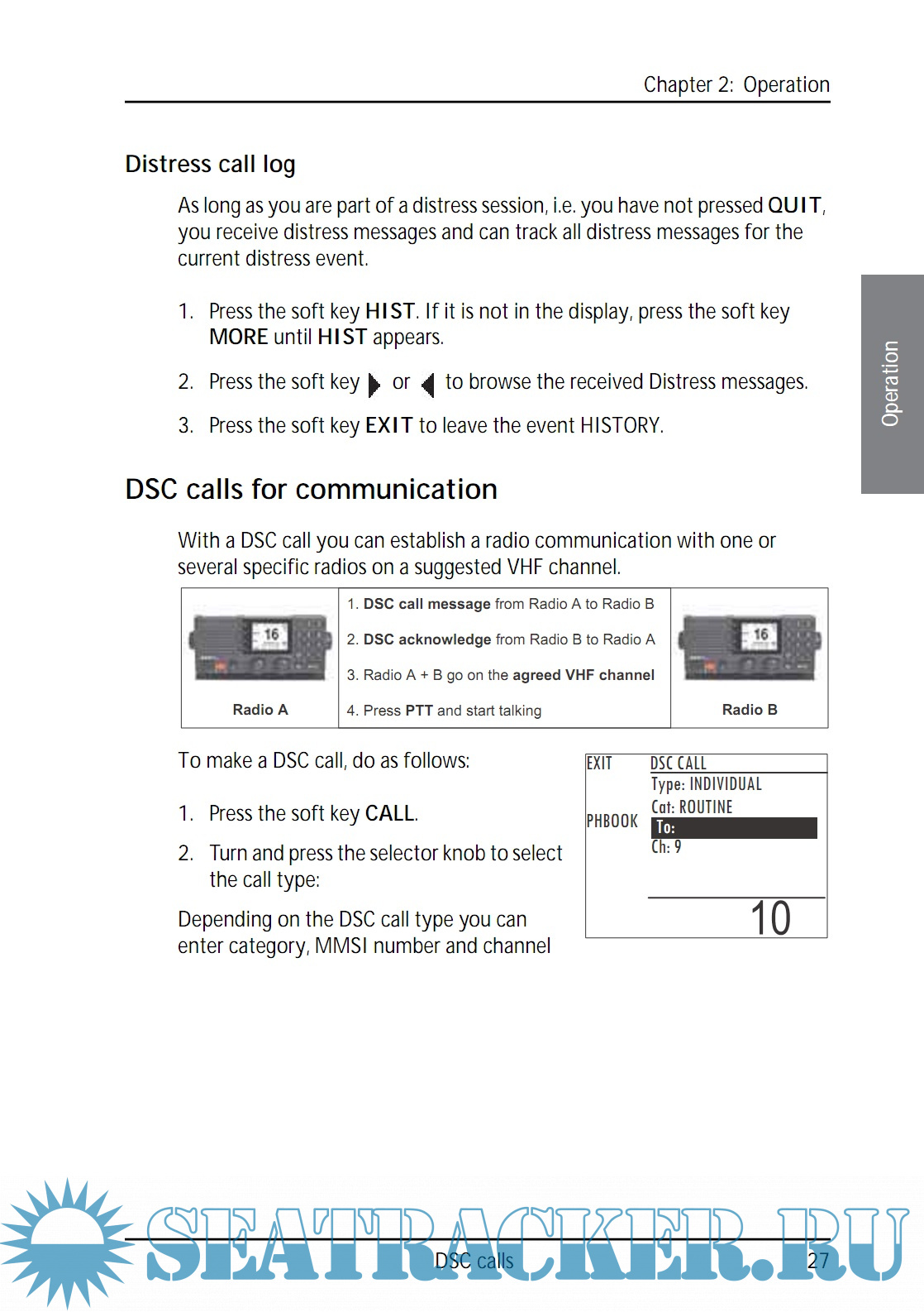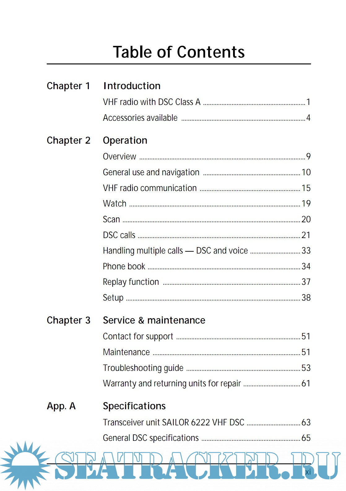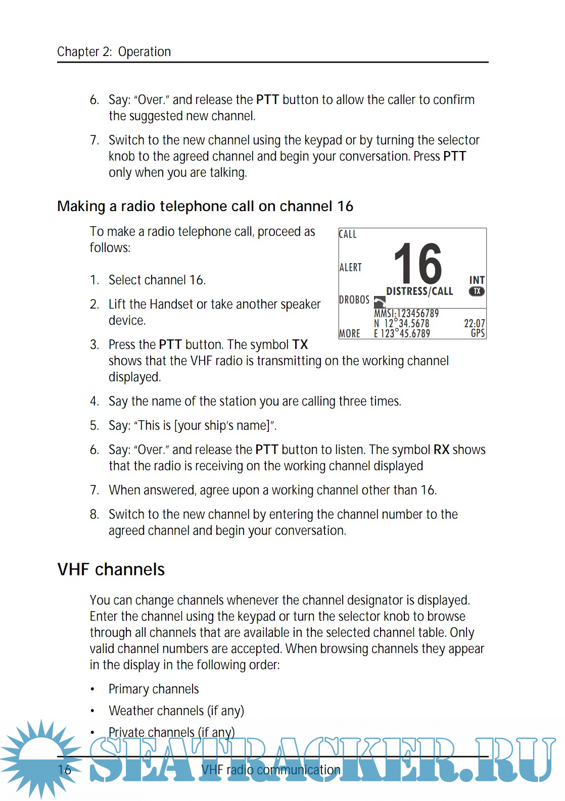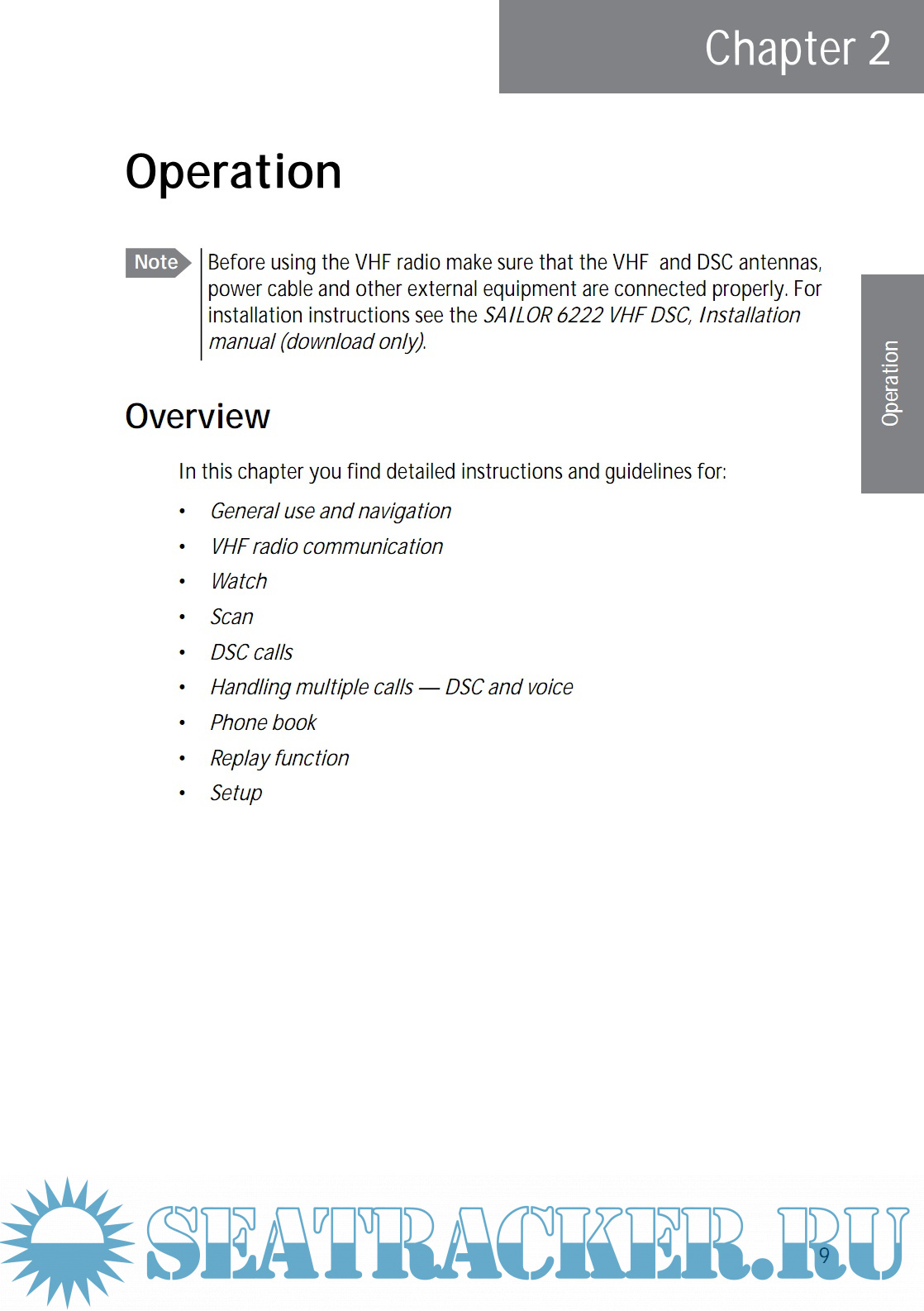 Year: 2016 Language: english Author: Thrane & Thrane A/S Genre: Manual Publisher: Thrane & Thrane A/S Format: PDF Quality: eBook Pages count: 94 Description: SAILOR 6222 VHF DSC your new VHF radio with full DSC functionality, is approved to MED, FCC and Industry Canada and is waterproof to the IPx8 and IPx6 standard. As part of the required safety equipment, use the SAILOR 6222 VHF DSC in an emergency situation. However the best way to guarantee functionality in an emergency situation, is to use the radio in daily communication on board. The VHF radio is a simplex/semi duplex VHF radio. It is designed with an easy-to-use menu-driven setup. You use the soft keys and the keypad to enter the desired functions, you browse and select a setting using the right selection knob. The large display can be customized for optimum readability and visibility both day and night with several color themes. The VHF radio can replay the last 240 s of received voice messages. This is a useful feature to minimize misunderstandings and to record messages when the radio is unattended. With SAILOR connection boxes the VHF radio connects easily to external equipment like additional handsets, water proof hand microphones, control speaker microphone, alarm panel or external speaker. The Ethernet interface enables the VHF radio to be connected to ThraneLINK for service updates. For a list of accessories available for the VHF radio see Accessories available on page 4 and check with your nearest distributor.