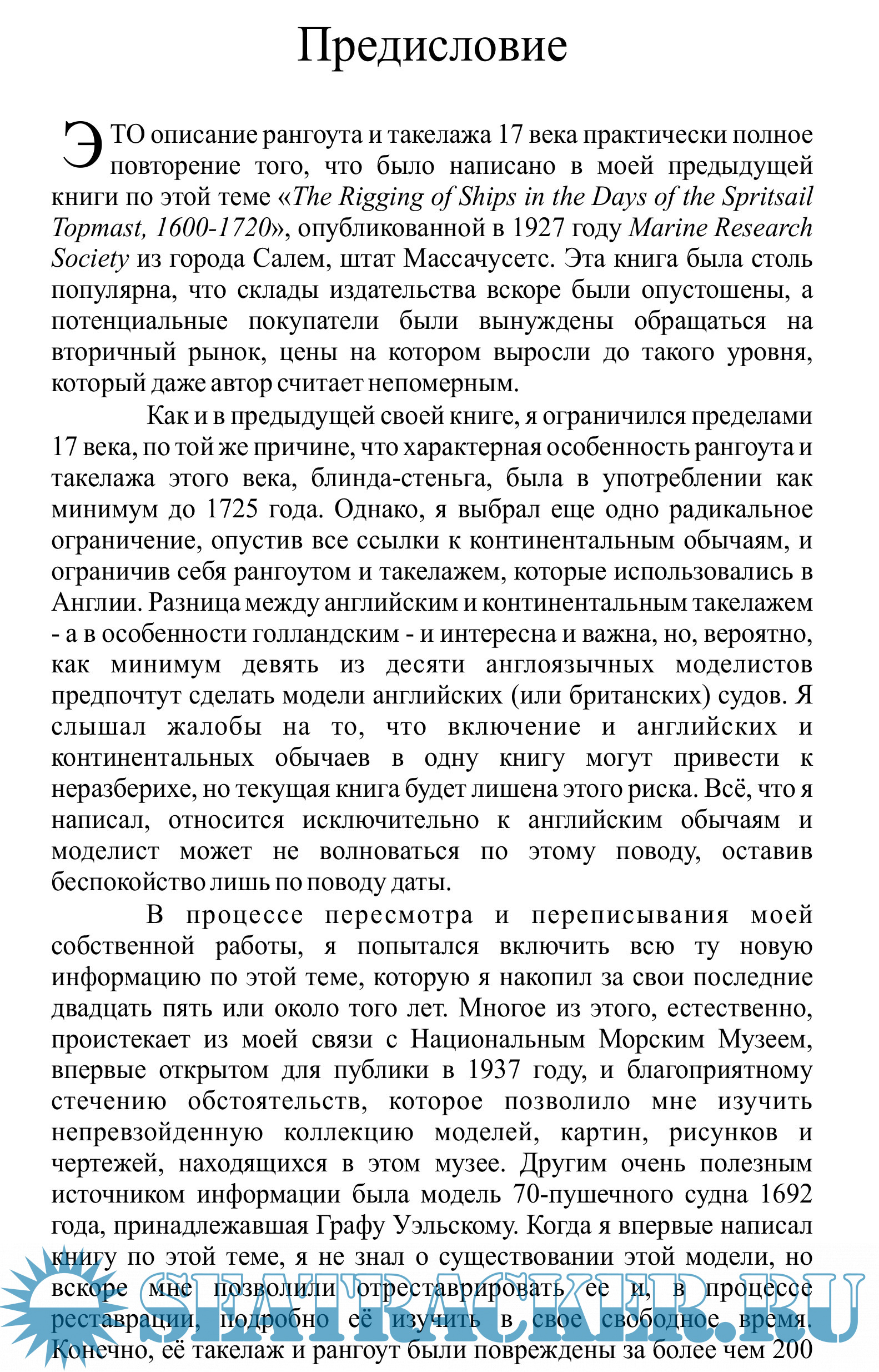 Описание: Эта обильно иллюстрированная книга бесценный источник информации для судомоделистов, студентов и энтузиастов исторических парусных кораблей. В ней подробно описано и нарисовано, как оснащались такелажем торговые и военные суда Англии в семнадцатом веке. Эта книга начинается с 1600 года, с которого появляется подробная информация по такелажу судов и с которого можно отследить появление характерной детали судов 17-го века, блинда-стеньги. Рассматриваемый в этой книге период оканчивается в 1720 году. Примерно в это время блинда- стеньга была заменена утлегарем и другими новшествами такелажа 18-го века. В этой книге 12 глав охватывают каждый аспект судового такелажа этого периода, от нижних мачт и бушприта до бегучего такелажа марселей и брамселей. Свыше 280 рисунков иллюстрируют каждый элемент, используемый в такелаже. В результате получился незаменимый источник информации для судомоделистов, морских историков и фанатов парусных судов - для всех, кто интересуется аутентичной документацией по судовому такелажу ключевого периода истории парусных судов.