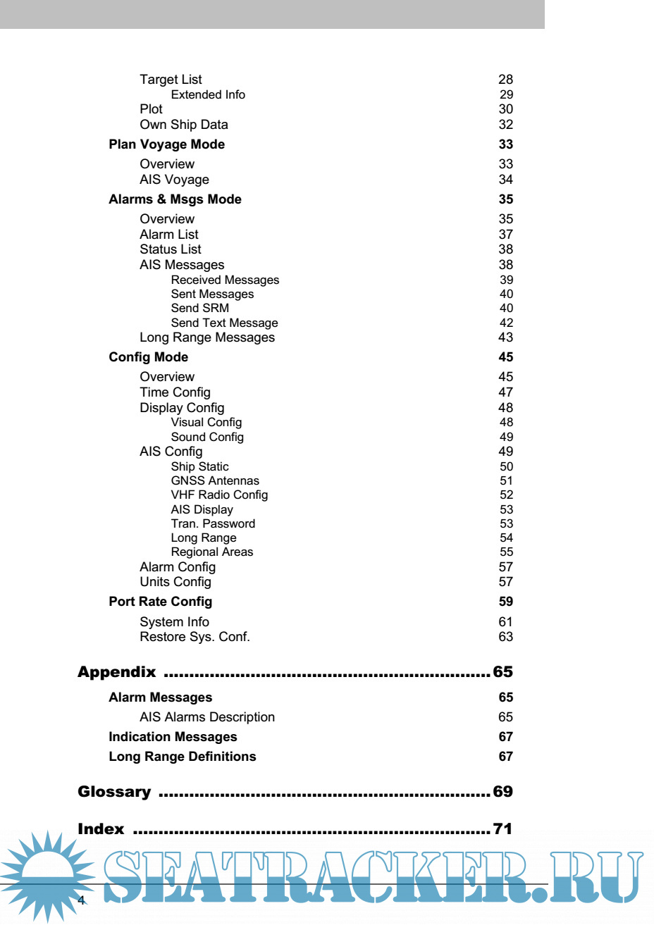 Year: 2006 Language: english Author: SAAB Genre: Manual Publisher: SAAB Edition: H Format: PDF Quality: eBook Pages count: 72 Description: The R4 AIS Class A Transponder System consists of an R4 AIS Transponder and an R4 Display. The R4 Transponder consists of a radio transceiver unit, a GPS receiver and a controller unit. The transceiver consist of one transmitter and three independent VHF receivers, two tunable TDMA receivers and one DSC receiver. The transmitter alternates its transmissions between the two operating TDMA channels and can also be used to reply a DSC interrogation (ITU-R M.825-3, Annex 1). The controller unit creates and schedules data packets (containing dynamic, static and voyage related data) for transmission based on the IMO performance standard for AIS. The R4 Transponder shall be connected to the ship’s sensors as required by the installation guidelines published by IALA. The R4 Transponder can interface external navigation and presentation systems that support required IEC 61162-1 sentences as set out in the Installation Manual. The R4 Transponder is prepared for connection to Long Range systems like Inmarsat C. The R4 Display provides a graphical user-friendly interface to the system. Via the display it is possible to plot the location of other ships, aids to navigation and search and rescue vessels. Information about other vessel can be listed sorted by range and optionally filtered showing only vessels within a specific sector. The display can also be used to send and receive messages, perform configuration as well as supervise the systems status.