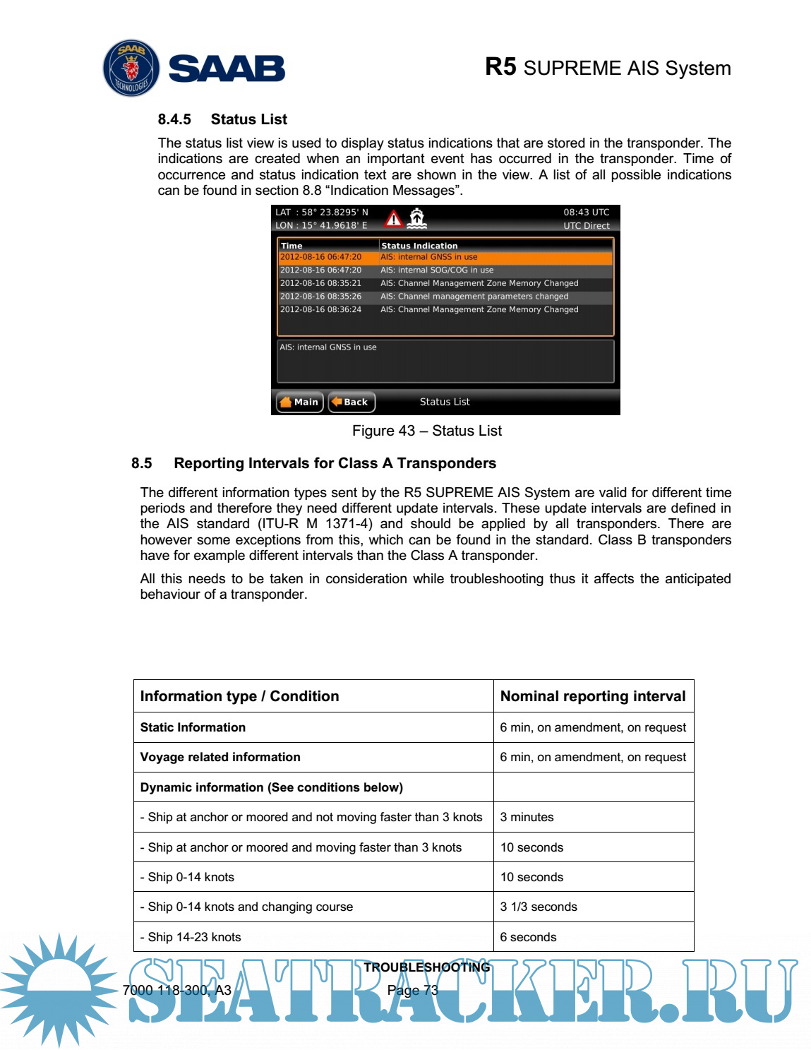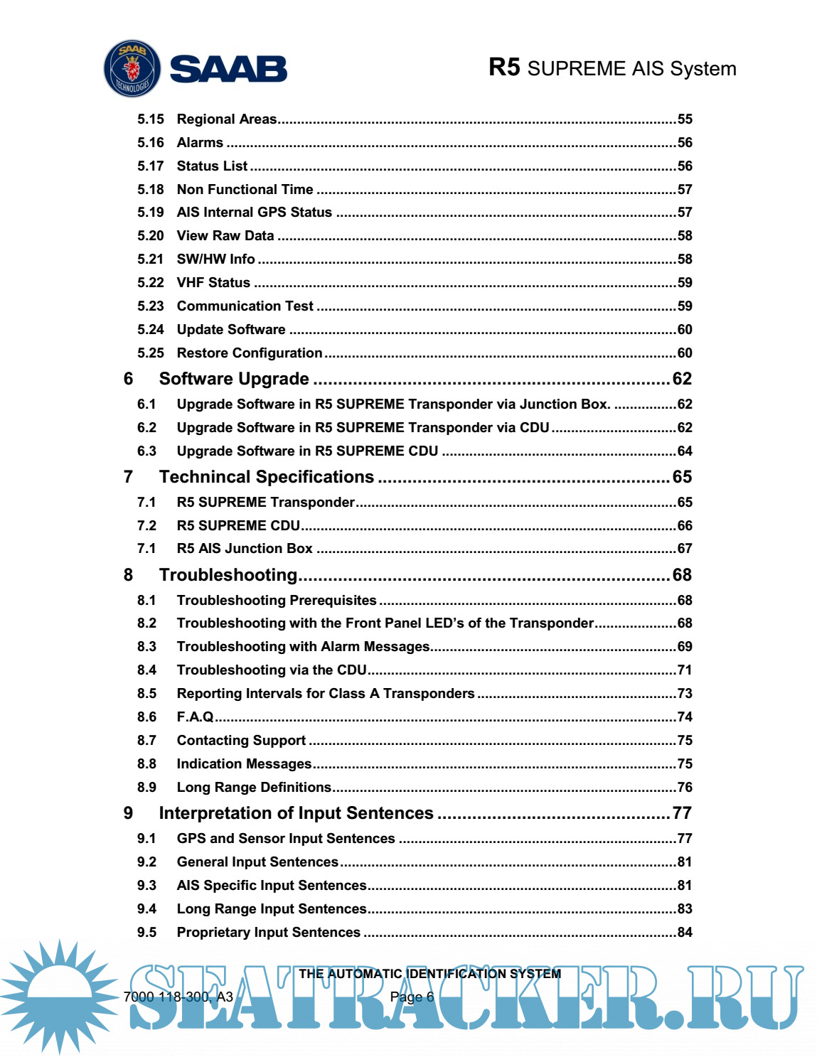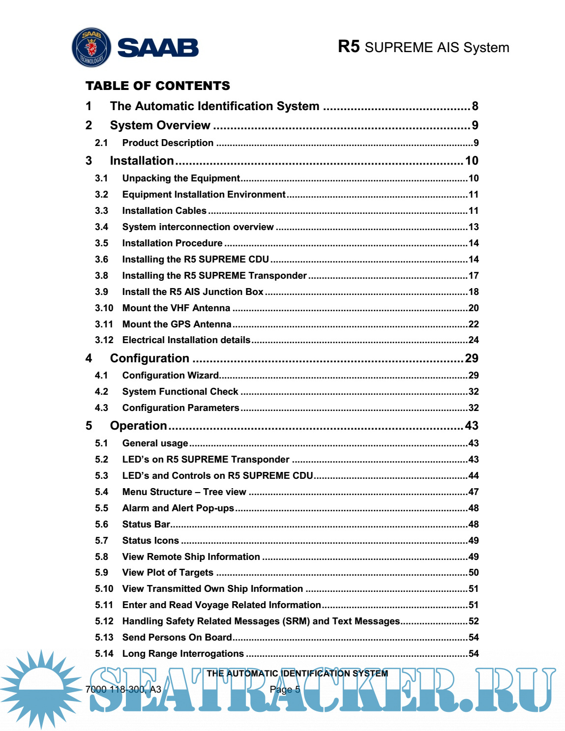 Year: 2017 Language: english Author: SAAB Genre: Manual Publisher: SAAB Edition: A3 Format: PDF Quality: eBook Pages count: 114 Description: The basic R5 SUPREME AIS Transponder System consists of three parts The R5 SUPREME Transponder The R5 SUPREME Control and Display Unit (CDU) The R5 AIS Junction Box The R5 SUPREME Transponder is a Class A unit consists of a transceiver radio unit, a 50 channel GPS receiver, and a controller unit. The radio has three receivers, two tuneable TDMA receivers and one DSC receiver. The transmitter alternates its transmissions between the two operating TDMA channels. The controller unit creates and schedules data packets (containing dynamic, static and voyage related data) for transmission based on the IMO performance standard for AIS. The R5 SUPREME CDU is the AIS configuration and display unit. The colour LCD together with the resistive touch interface provides a graphical user-friendly interface to the system. The resistive touch panel allows functionality under all weather conditions. Under rough sea, the rubber keypads can be used instead of the touch interface. With the R5 SUPREME CDU it is possible to plot the location of other ships, aids to navigation and search and rescue vessels. The R5 SUPREME CDU can also be used to send and receive messages, perform configuration as well as supervise the R5 SUPREME transponder systems status. The front hatch of the CDU is covering an integrated AIS Pilot Plug connector, as well as USB port and MMC/SD card slot. Note: The hatch has a screw lock mechanism. It is optional to use this lock. Recommended screwdriver for CDU hatch lock is flat tip 5.5-6.5mm. The R5 AIS Junction Box allows for easy connection of external equipment to the transponder unit. The R5 SUPREME transponder shall be connected to the ship‟s sensors as required by the installation guidelines published by IALA. The R5 SUPREME can interface external navigation and presentation systems that support required IEC 61162-1 sentences. Refer to chapter 9 “Interpretation of Input Sentences” for more information. The R5 SUPREME is prepared for connection to Long Range systems like Inmarsat C.
