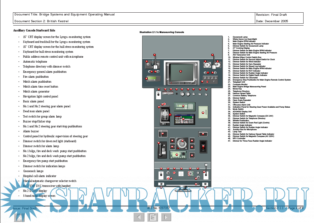 Year: 2005 Language: english Author: Worldwide Marine Technology ltd. Genre: Documentation Format: PDF Quality: eBook Pages count: 286 Description: The purpose of this ‘one-stop’ manual is to assist, inform and guide competent ship’s staff, and trainees in the operation of the systems and equipment on board and to provide additional information that may not be otherwise available. In some cases, the competent ship’s staff and trainees may be initially unfamiliar with this vessel and the information in this manual is intended to accelerate the familiarisation process. It is intended to be used in conjunction with shipyard drawings and manufacturer’s instruction manuals, bulletins, Fleet Regulations, the ship’s Captain’s and Chief Engineer’s Standing Orders and in no way replaces or supersedes these publications, all of which take precedence over this manual. Information relevant to the operation of the British Kestrel has been carefully collated in relation to the systems of the vessel and is presented in three on board volumes consisting of BRIDGE SYSTEMS AND EQUIPMENT OPERATING MANUAL, CARGO OPERATING MANUAL and MACHINERY OPERATING MANUAL. This release contains Bridge Systems and Equipment Operating Manual.