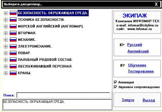 Следуя рекомендациям Международной Морской Организации (ИМО) и Морской Администрации России, Российским предприятием ИНФОМАР-ТЕХ разработан мультимедийный программный комплекс МПК ЭКИПАЖ 2002, предназначенный для проверки знаний и обучения российских моряков в объеме требований конвенции ПДНВ 78/95. Для разработки МПК ЭКИПАЖ 2002 привлекались ведущие специалисты Московской Государственной Академии водного транспорта.