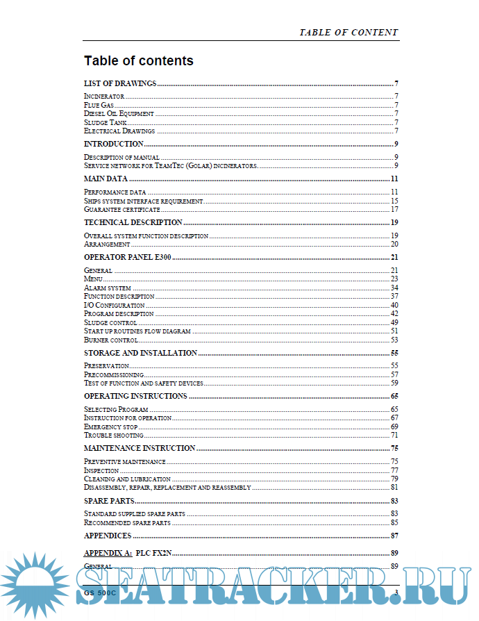 List of drawings Introduction Main data Technical description Operator panel E300 Storage and installation Operating instructions Maintenance instruction Spare parts Appendices Drawings