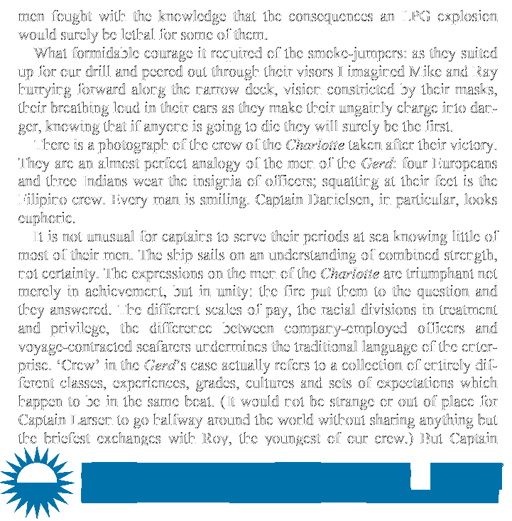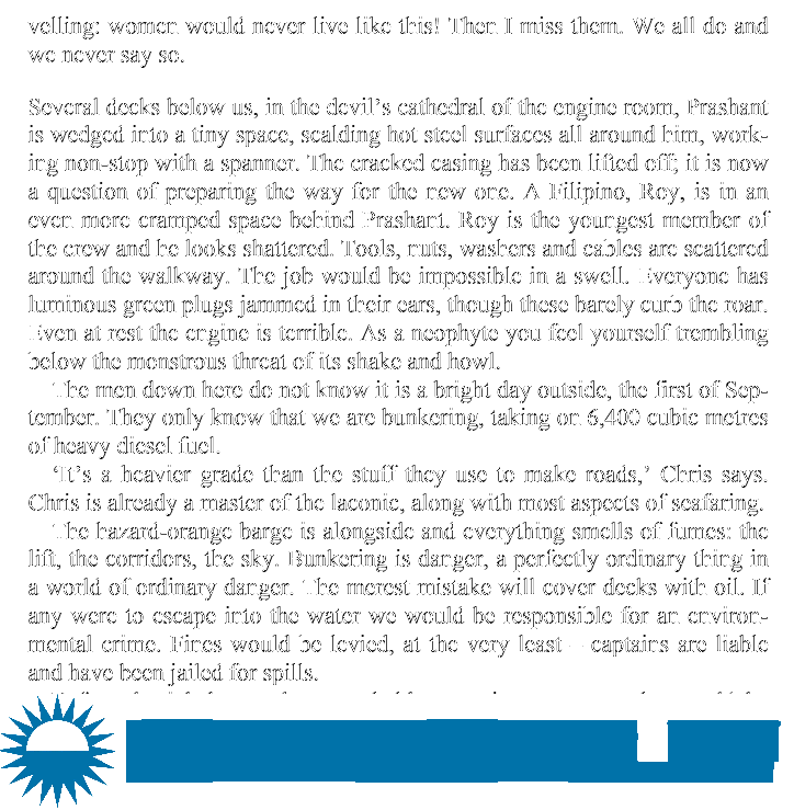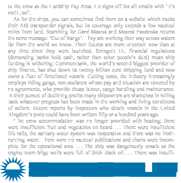 Clare's work has more literary style in contrast to George's data-driven investigative journalism. As well as the recent past, Clare contrasts seafarers' lives on container ships in 2011-12 to those on sailing ships centuries ago and to a wide body of literature: from Richard Hakluyt (1589) to Sebastian Junger (1997).