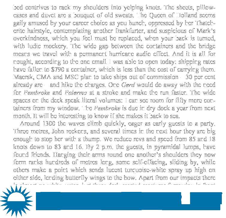 In 2011-12, he was writer-in-residence with Maersk Lines, sailing aboard the Gerd Maersk (LOA 367 m; 10,000 TEU; Danish flag) from Felixstowe to Port Said and from the Port of Tanjung Pelapas via China to Los Angeles and then on the Maersk Pembroke (LOA 210 m; 2,900 TEU; Netherlands flag; now scheduled to be scrapped) from Antwerp to Montreal.