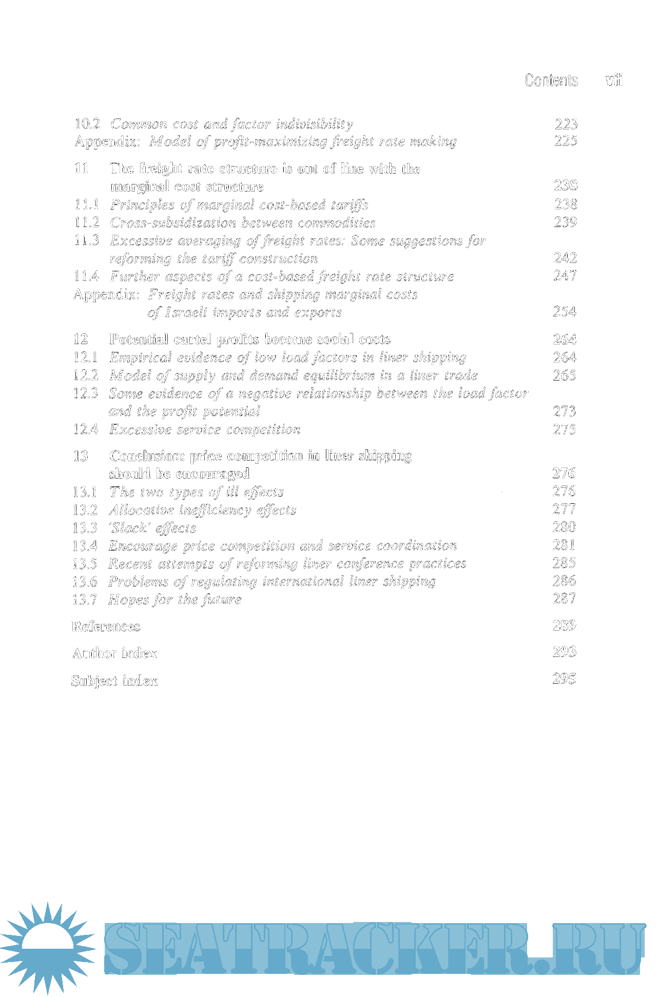 Year: 2012 Language: english Author: Jansson, Jan Genre: Textbook Format: PDF Quality: OCR without errors Pages count: 300 Description: The importance of international liner shipping needs little emphasizing. A large majority of international trade moves by sea, and the liner shipping share in total freight revenue exceeds one-half. Notwithstanding, people in general know surprisingly little about the basic facts of the liner shipping industry, and, in particular, about the economics ofliner shipping. Perhaps because it is an international industry, where shipping lines flying many different flags participate, it has tended to fall in between national accounts of domestic industries. Even transport economists have, generally speaking, treated liner shipping rather 'stepmotherly'; besides the work of Bennathan and Walters (1969), a relatively small group of specialized maritime economists, including A. Stromme-Svendsen, T. Thorburn, S. Sturmey, R. Goss, and B. M. Deakin, have in the post-war period made important contributions to the subject, but so far no coherent and reasonably comprehensive treatise of liner shipping economics has appeared. The first purpose of the present volume is therefore obvious: to provide just that. The book is divided in three parts: Part I The liner shipping industry; Part II Liner service optimization; Part III Economic evaluation of the conference system. Needless to say, all three parts concur to fulfill the first purpose of providing a complete book of liner shipping economics. In Part II a more or less separate, second, purpose has been to develop analytical tools for liner service optimization. Thereby we use different approaches.