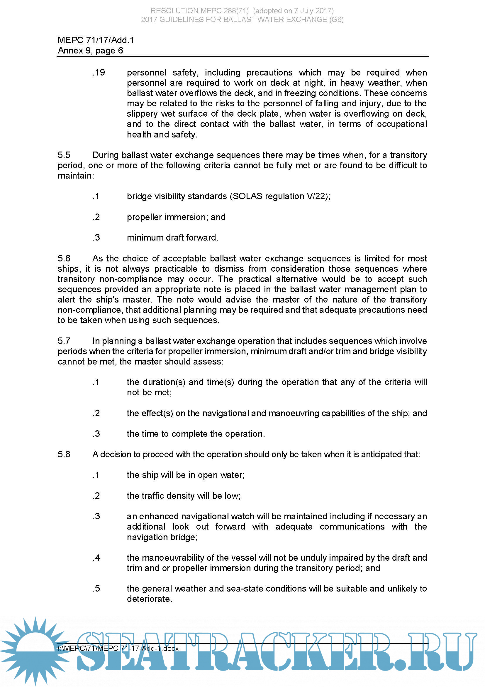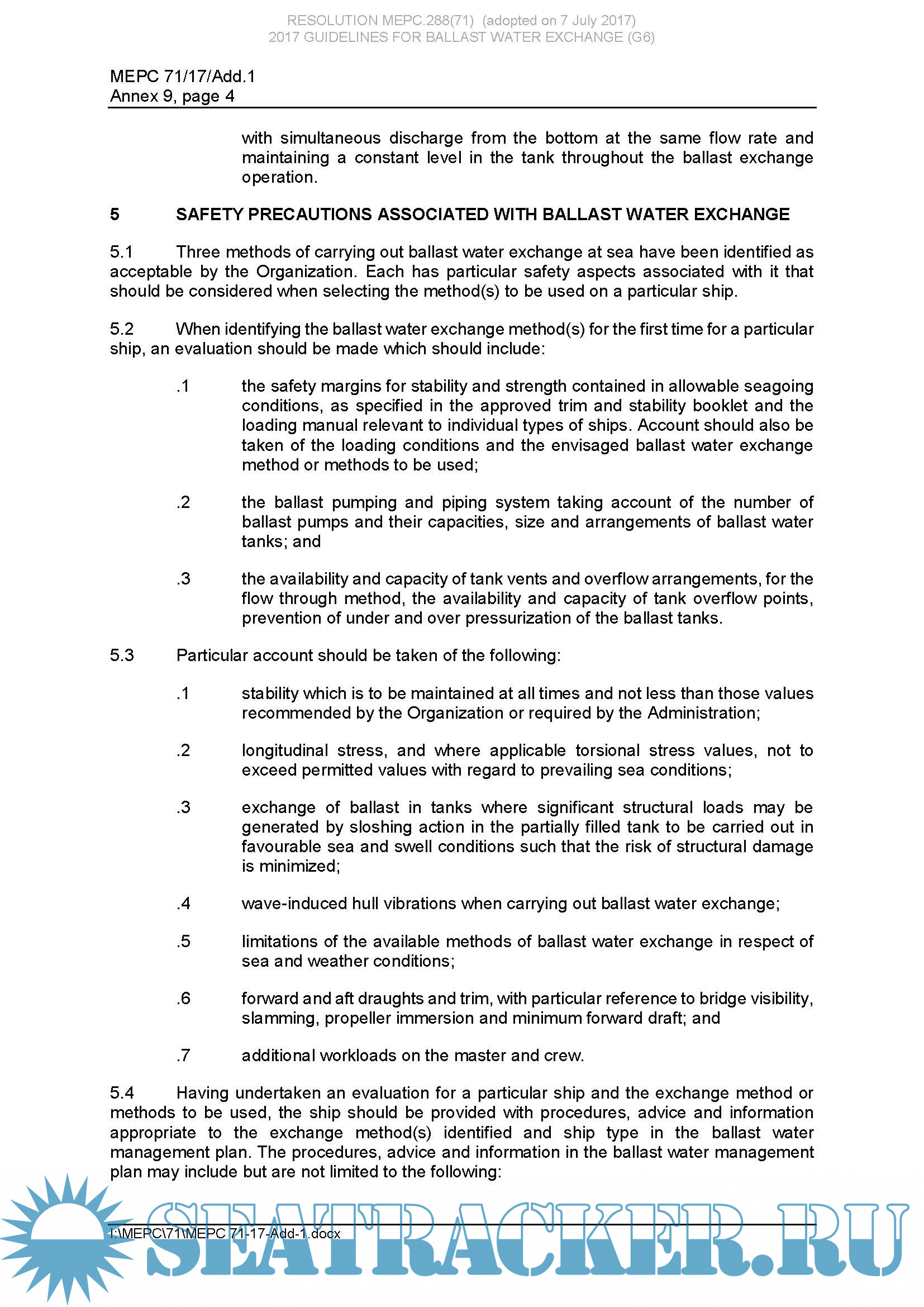 Year: 2017 Language: english Author: IMO Genre: Convention (rules) Format: PDF Quality: eBook Pages count: 9 Description: The purpose of these Guidelines is to provide shipowners and operators with general guidance on the development of ship specific procedures for conducting ballast water exchange. Whenever possible shipowners and operators should enlist the assistance of classification societies or qualified marine surveyors in tailoring ballast exchange practices for various conditions of weather, cargo and stability. The application of processes and procedures concerning ballast water management are at the core of the solution to prevent, minimize and ultimately eliminate the introduction of harmful aquatic organisms and pathogens. Ballast water exchange offers a means, when used in conjunction with good ballast water management practices, to assist in achieving this solution.