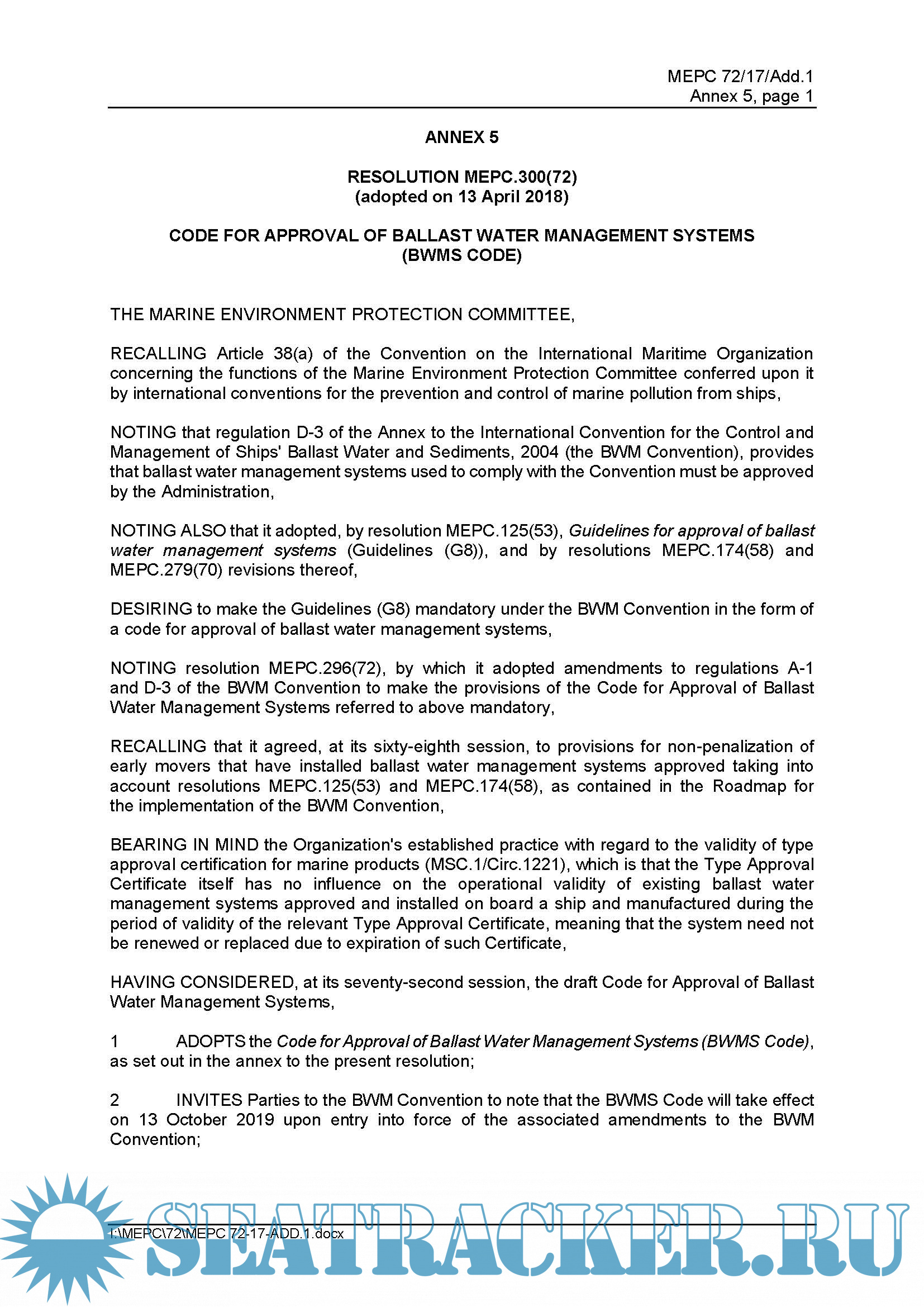 Resolution MEPC.300(72) (adopted on 13 April 2018) Code For Approval Of Ballast Water Management Systems (BWMS CODE)