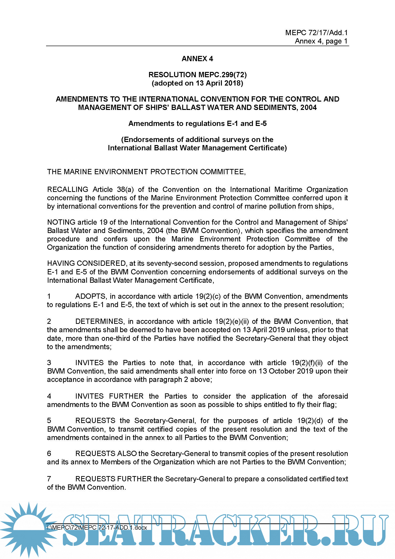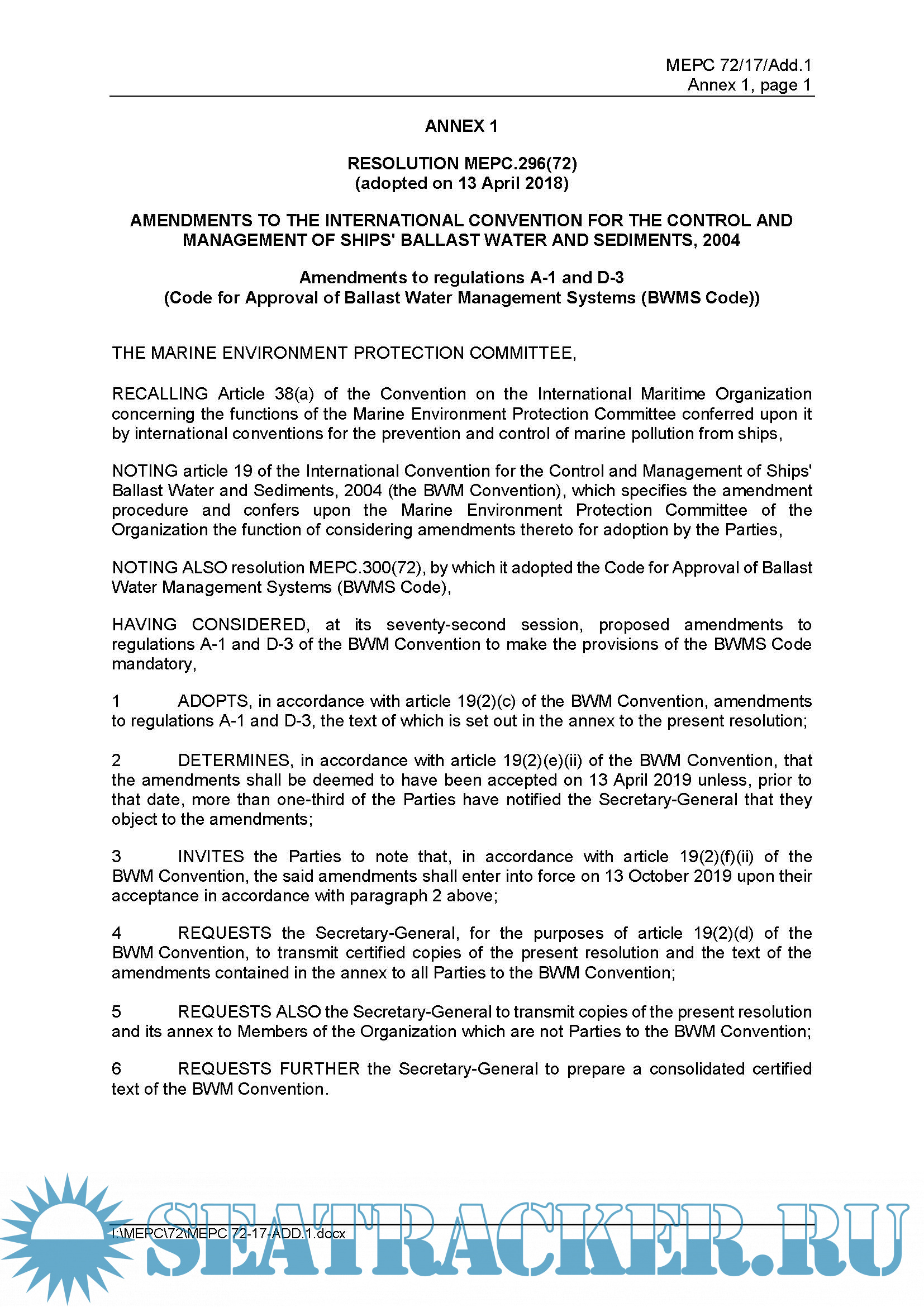 Plus the Amendments to BWMS Code and BWM Convention adopted by