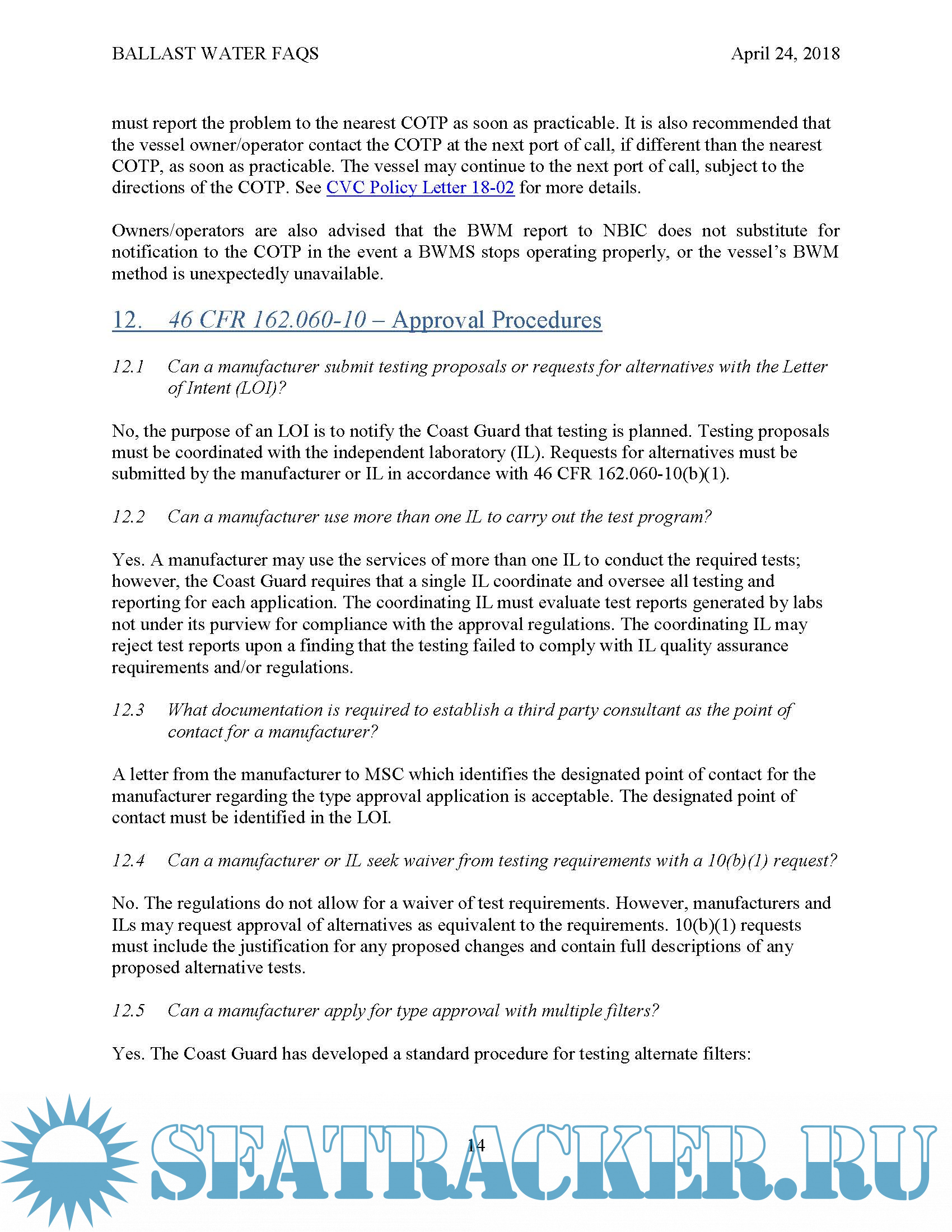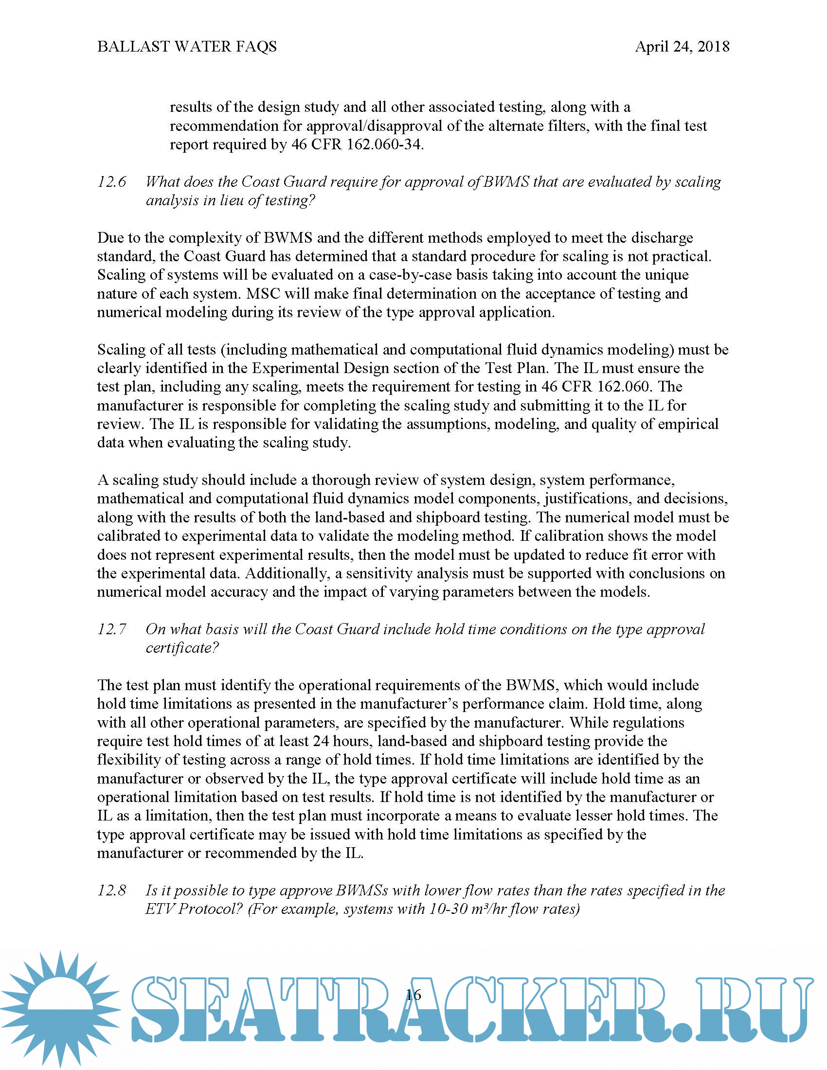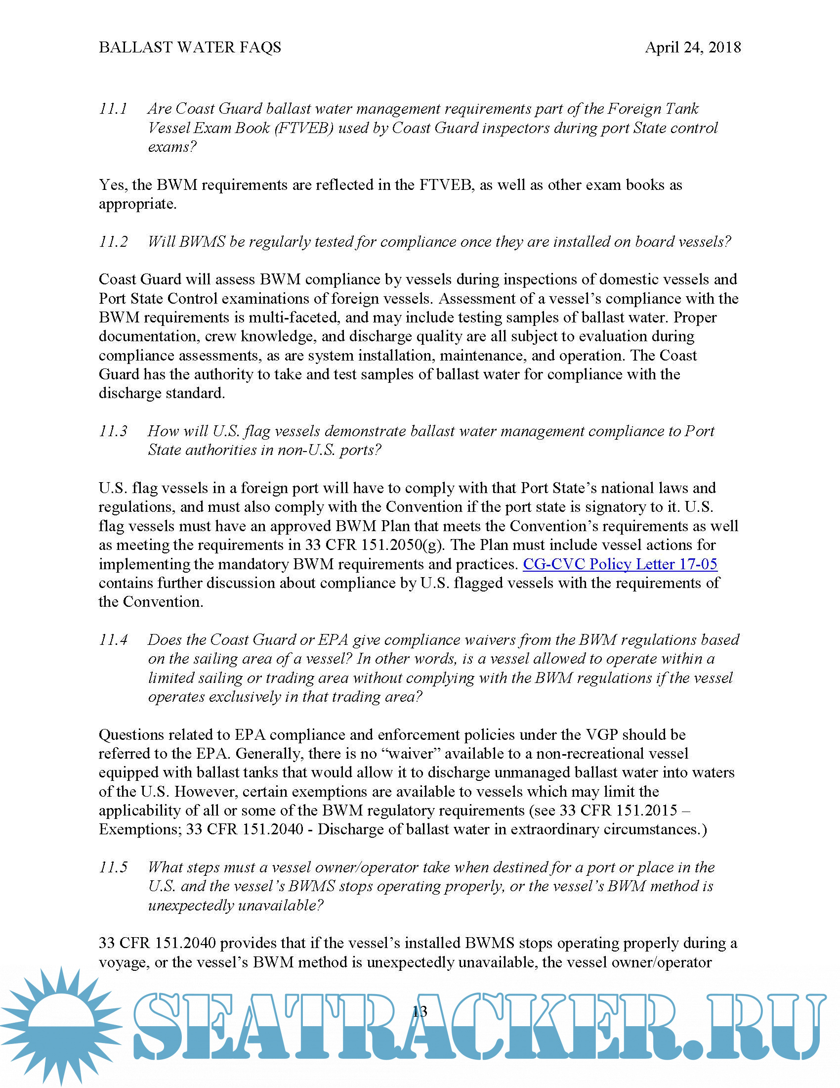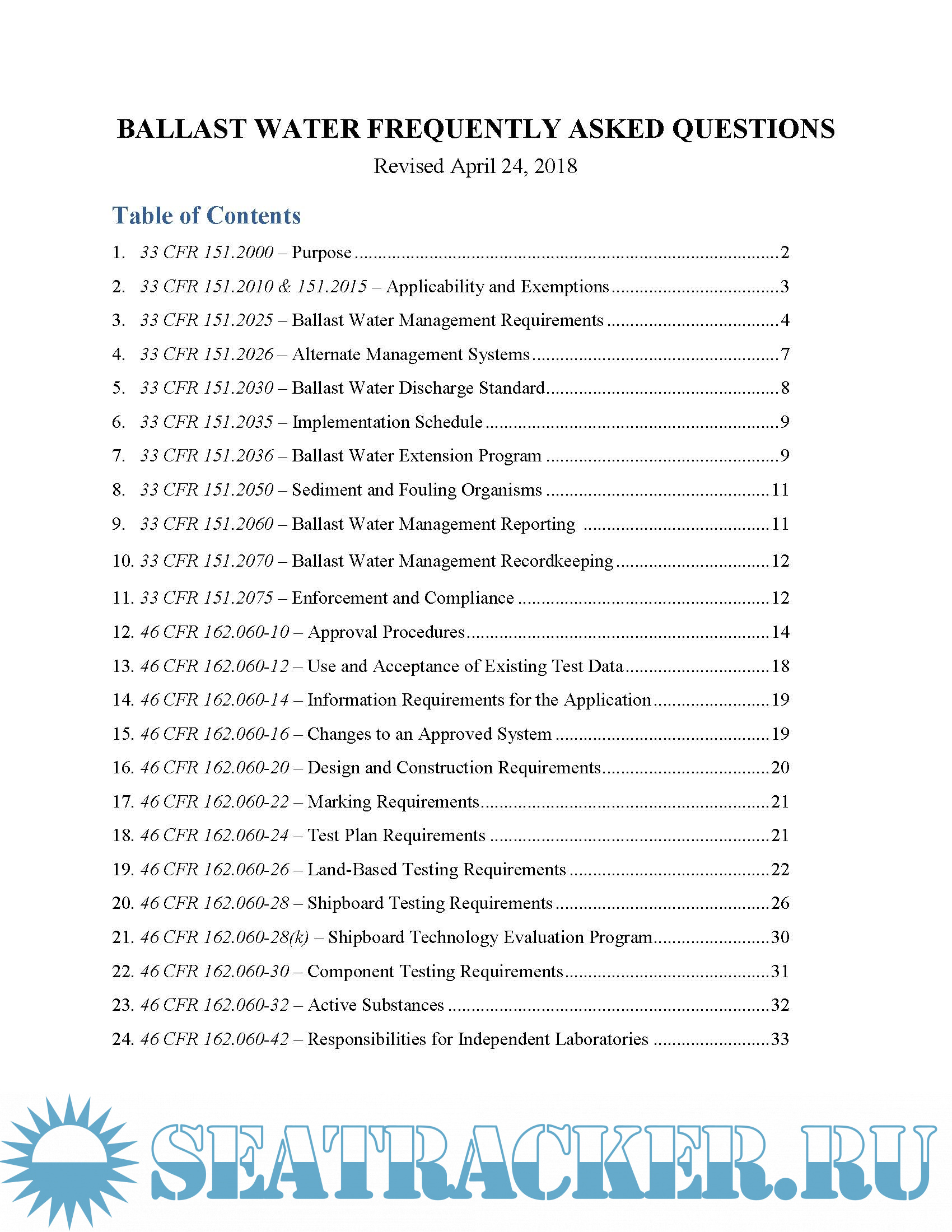 Ballast Water Frequently Asked Questions, Revised April24,2018