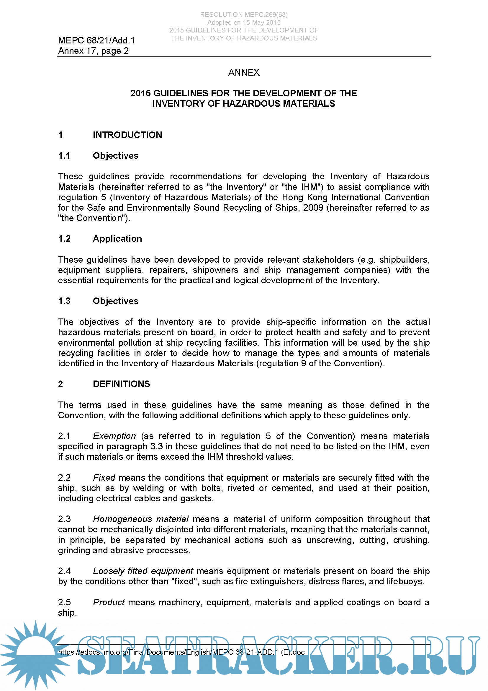 Description: These guidelines provide recommendations for developing the Inventory of Hazardous Materials to assist compliance with regulation 5 (Inventory of Hazardous Materials) of the Hong Kong International Convention for the Safe and Environmentally Sound Recycling of Ships, 2009 .
