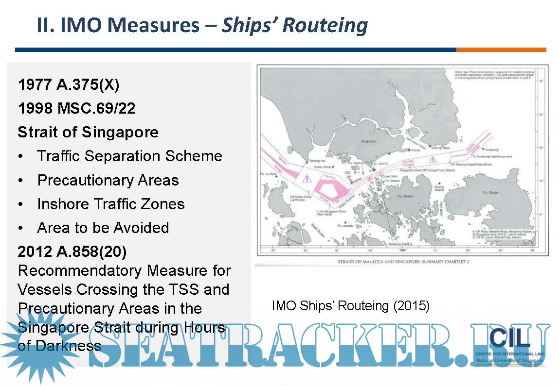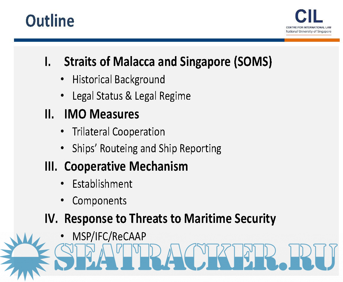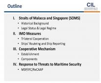 Year: 2017 Language: english Author: CIL Genre: Presentation Format: PDF Quality: eBook Pages count: 63 Description: I. Straits of Malacca and Singapore (SOMS) • Historical Background • Legal Status & Legal Regime II. IMO Measures • Trilateral Cooperation • Ships’ Routeing and Ship Reporting III. Cooperative Mechanism • Establishment • Components IV. Response to Threats to Maritime Security • MSP/IFC/ReCAAP