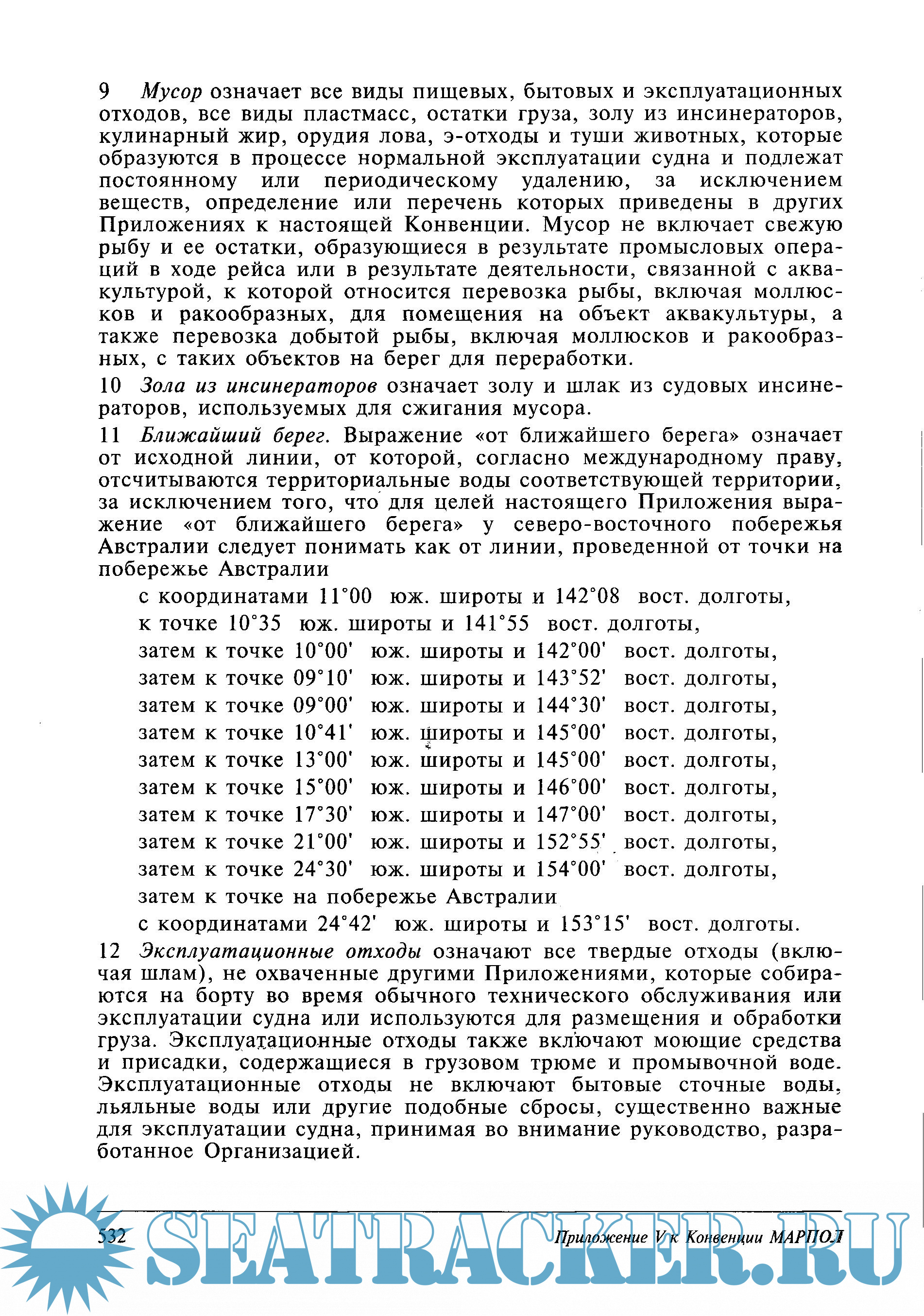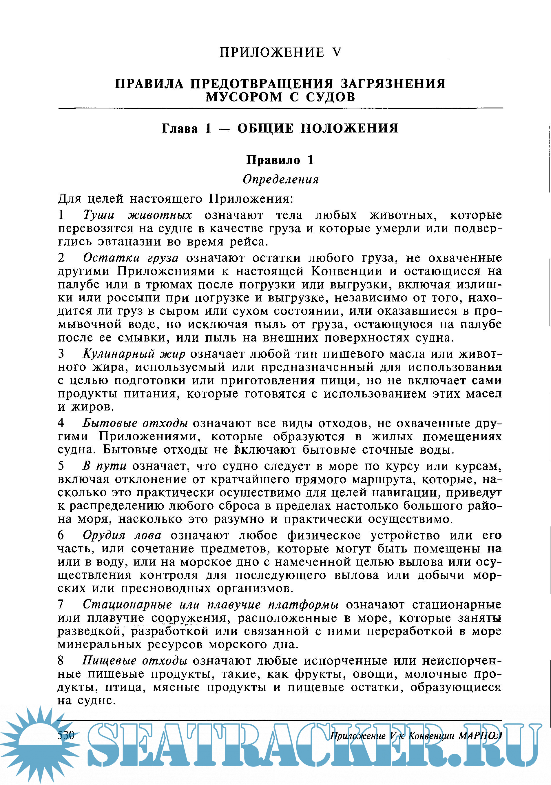 К сожалению на сегодняшний день отдельного издания на русском языке Приложения V к МК МАРПОЛ как в живую, так и на просторах интернета мне не встречался. Пришлось сканировать текст с оригинального русскоязычного издания МАРПОЛ с применением внешней картинки. Если найдете скрин обложки подобного издания на русском языке, поменяйте, я не обижусь. К англоязычной версии представлена ссылка