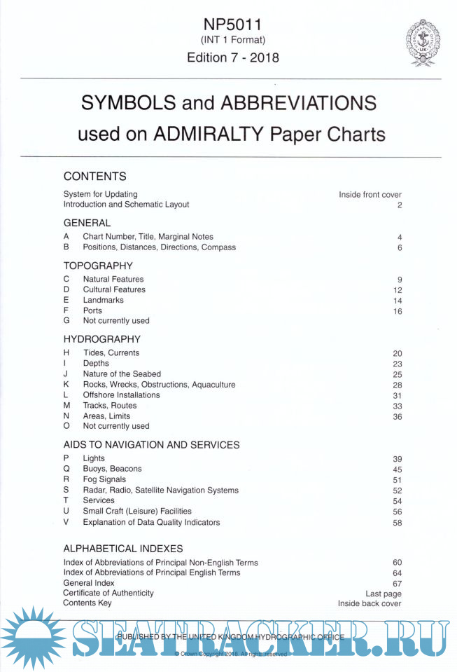 Year: 2018 Language: english Author: UKHO Publisher: UKHO Edition: 7th ISBN: 978-0-70-774-6029 Format: PDF Quality: Scanned pages Pages count: 75 Description: Gives details on symbols and abbreviations used on the worldwide range of ADMIRALTY charts, and international Chart Series Paper Charts. It also contains information on hydrography, topography and navigational aids and services. • Admiralty and INT (from the international chart series) symbols clearly illustrated in full color • Hydrography - the nature and conditions of the seabed • Topography - natural and man-made features • Navigational aids and services • Abbreviations of principal English and foreign charts • General information on the content of Admiralty Charts