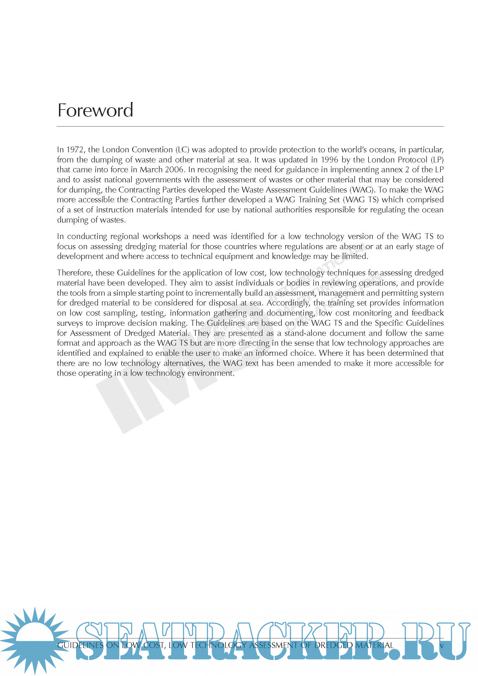 Year: 2015 Language: english Author: IMO Genre: Guide Publisher: Polestar Wheatons Edition: 2015 ISBN: 978-92-801-1606-9 Format: PDF Quality: eBook Pages count: 89 Description: This document provides guidance on the application of the waste assessment guidelines (WAG) using low technology and low cost methods. For example, it contains details on low cost sampling, testing, information gathering and documenting, consistent with the WAG, to allow characterization of the dredged material and selection of suitable disposal sites, including guidance on simple and low cost monitoring of disposal activities, and feedback surveys to improve decision making.