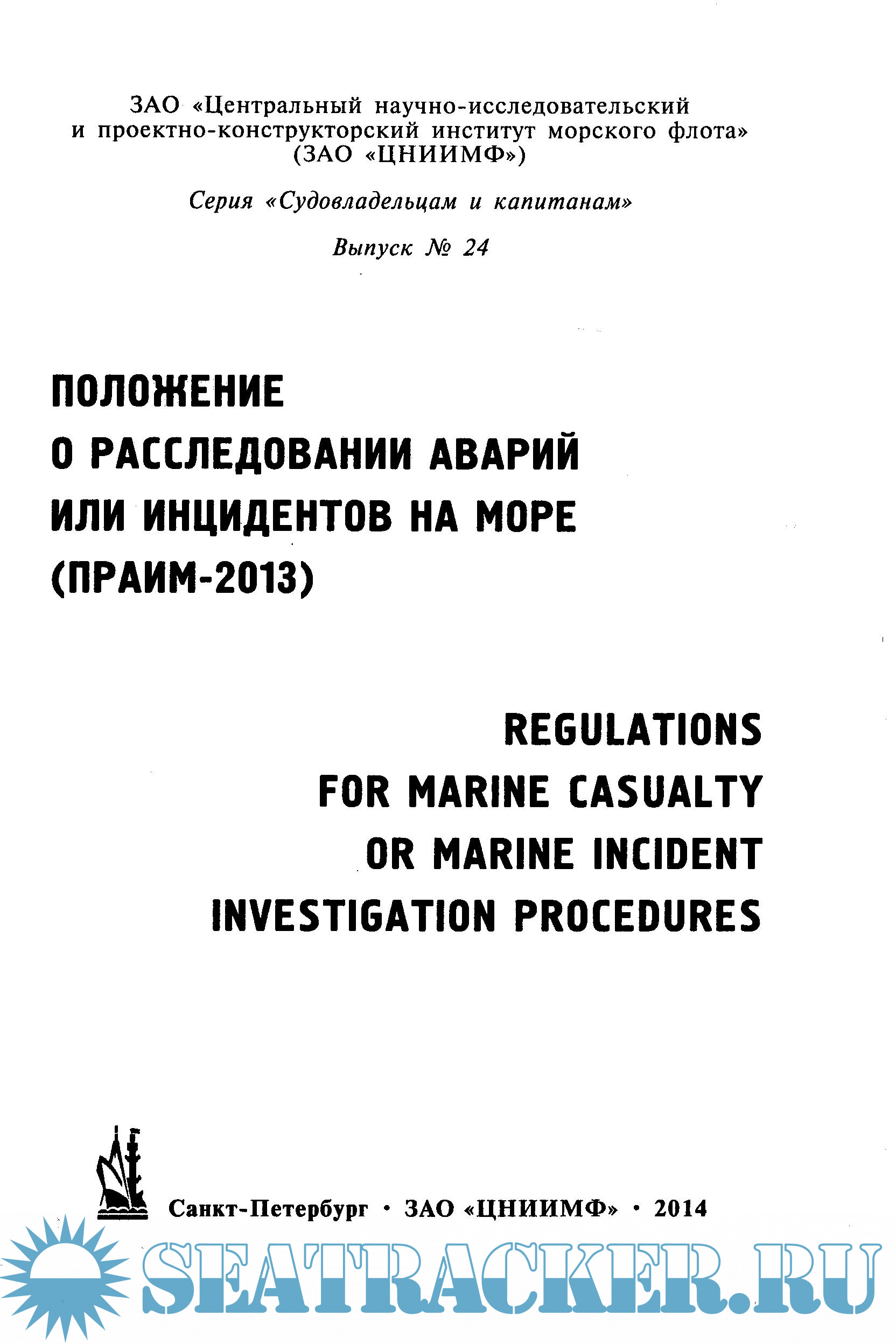 Положение о расследовании аварий или инцидентов на море (ПРАИМ-2013) на русском и английском языках, – СПб.: ЗАО "ЦНИИМФ", 2014 г. - 48 с. Серия "Судовладельцам и капитанам", выпуск 24