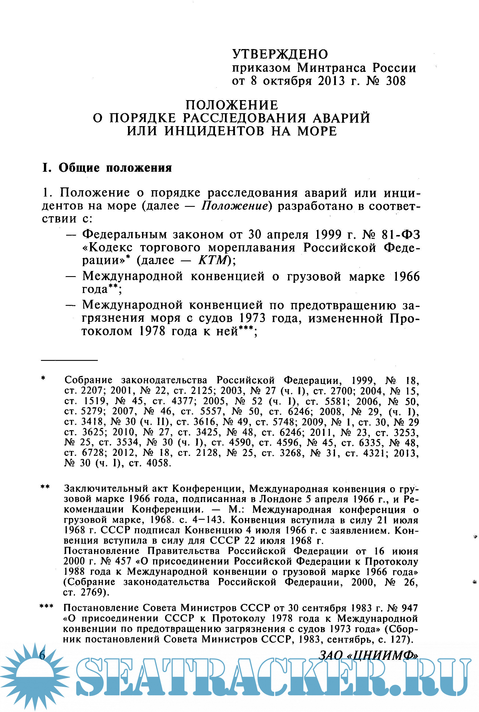 В издании приводится Положение о расследовании аварий или инцидентов на море, утвержденное приказом № 308 от 08.10.13 г. Министерства транспорта Российской Федерации, зарегистрированного в Минюсте России 19.02.14 № 31355.