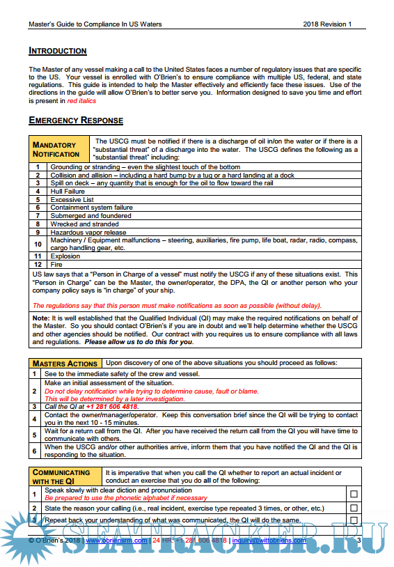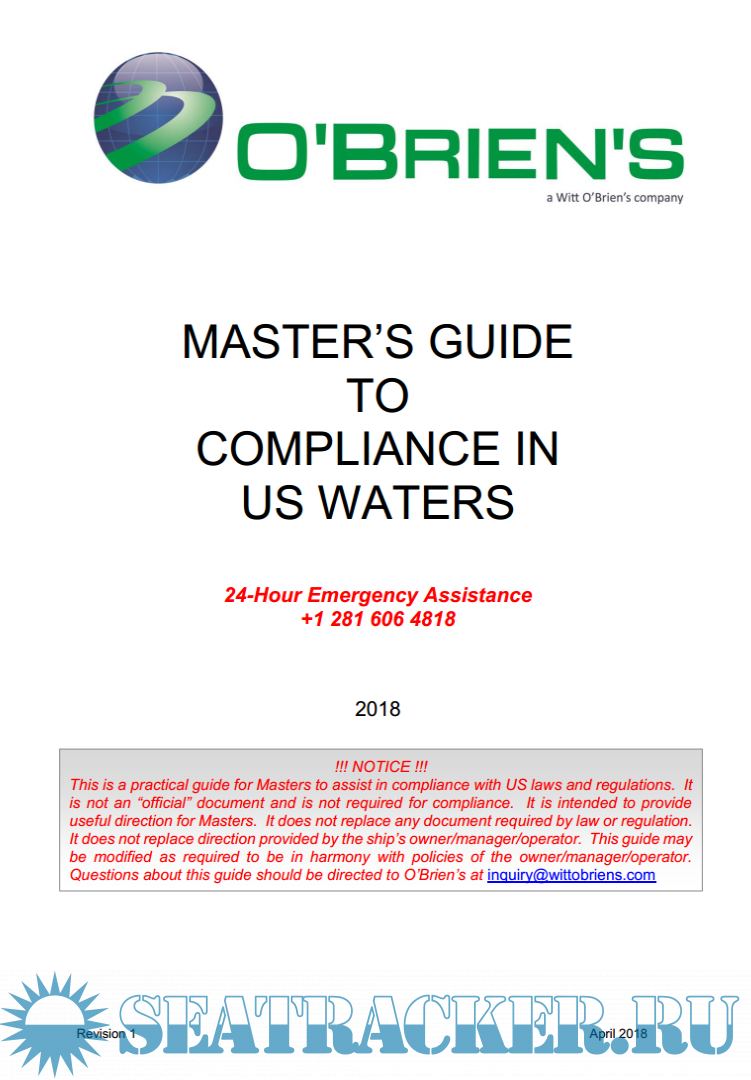 Description: This is a practical guide for Masters to assist in compliance with US laws and regulations. It is not an “official” document and is not required for compliance. It is intended to provide useful direction for Masters. It does not replace any document required by law or regulation. It does not replace direction provided by the ship’s owner/manager/operator. This guide may be modified as required to be in harmony with policies of the owner/manager/operator. Questions about this guide should be directed to O’Brien’s at [email protected]