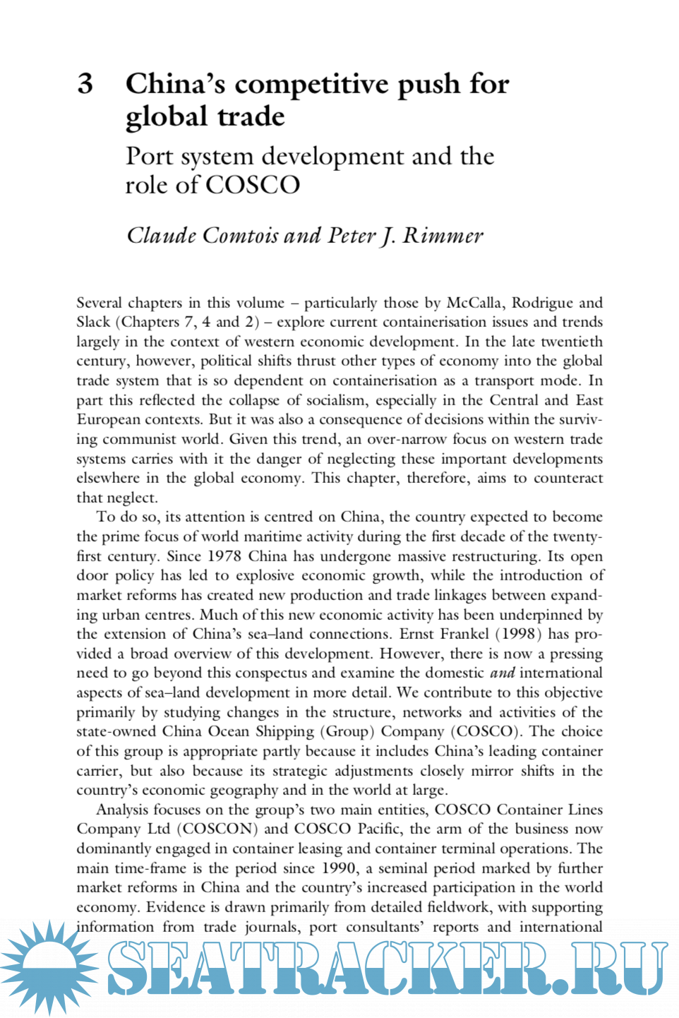 Year: 2004 Language: english Author: Edited by David Pinder and Brian Slack Genre: Research papers Publisher: Routledge Edition: 1st ISBN: 0-203-57119-3 Format: PDF Quality: OCR without errors Pages count: 304 Description: Shipping and port systems are vital to societies and lifestyles around the world. In the late twentieth century, however, assumptions concerning the robustness of these systems were severely shaken by economic shocks largely triggered by oil crises. This volume explores the resolution of many of the consequent uncertainties, and how adapted systems have been shaped to meet the challenges of the new millennium, focusing particularly on three closely interrelated themes: globalisa- tion, technological change and the environment. Contributors examine subjects as diverse as: • economic integration of emerging economies – in particular China • the cruise tourism phenomenon and global integration • new conceptual perspectives on port and shipping development • technological drivers in the high-speed ferry and offshore oil industries • pollution management challenges for shipping and ports.