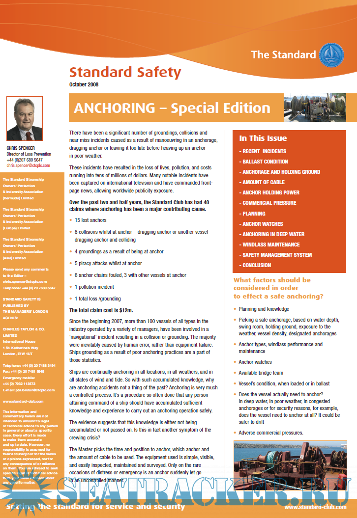 In This Issue - RECENT INCIDENTS - BALLAST CONDITION - ANCHORAGE AND HOLDING GROUND - AMOUNT OF CABLE - ANCHOR HOLDING POWER - COMMERCIAL PRESSURE - PLANNING - ANCHOR WATCHES - ANCHORING IN DEEP WATER - WINDLASS MAINTENANCE - SAFETY MANAGEMENT SYSTEM - CONCLUSION