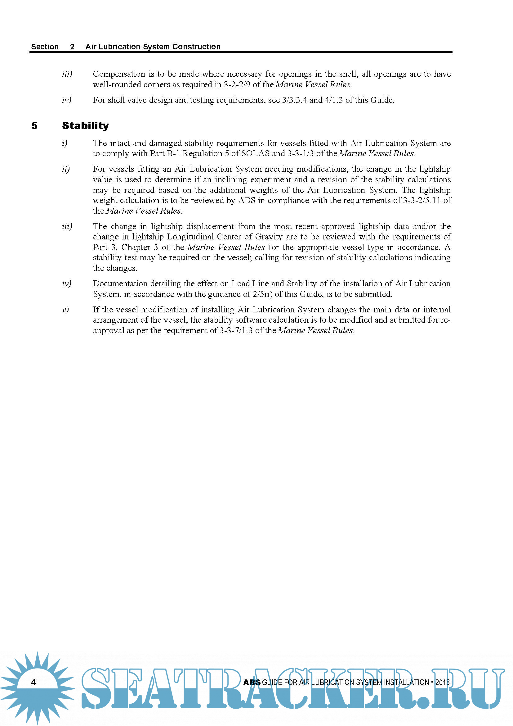 Year: 2018 Language: english Author: ABS Genre: Guide Format: PDF Quality: eBook Pages count: 12 Description: This Guide is applicable to three air lubrication technologies: air bubble, air layer and air cavity methods, which are currently in various degrees of development by the industry. These technologies are continuously evolving. Alternative arrangements, designs and technologies may be acceptable on a case-by-case basis provided they can be demonstrated, through either satisfactory service experience or a systematic analysis based on sound engineering principles, to meet the overall requirements of this Guide. The effective date of this Guide is the first day of the month of publication.