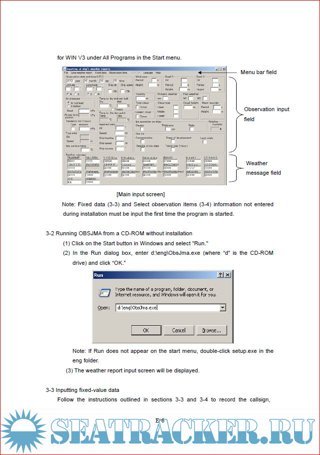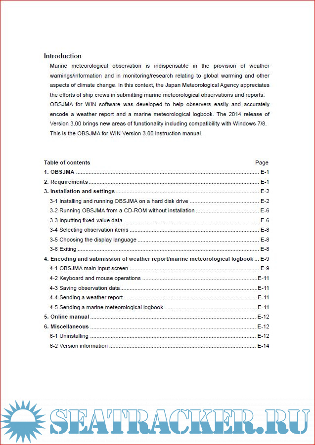 Year: 2014 Version: 3.0 Developer: Japan Meteorological Agency Platform: Windows 64-bit OS compatibility: unknown Localization: english Crack: Not needed Description: OBSJMA is designed to help encode observational data (a weather message and a marine meteorological logbook) on your PCs. It has the following features as below. To facilitate encoding, users can display various auxiliary input screens while inputting observational data in another window. Observational data are automatically saved in the designated folder in the form of weather report and marine meteorological logbook. - You can send a weather report from the Inmarsat transmitter by uploading the weather report file (yymmddhh.tlx). - In addition you can send a floppy disk or CD-R saving the marine meteorological logbook file (immt5.log) by mail in lieu of a paper logbook when you make a port call at a Japanese port. You can send it by e-mail to [email protected]. The software's checking of weather reports greatly reduces the incidence error.