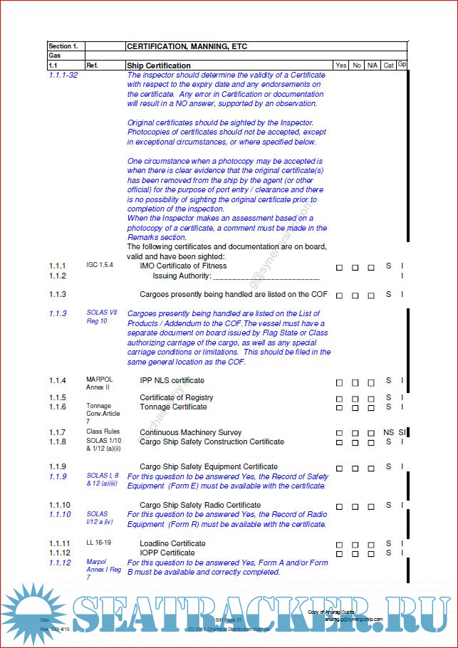 The SIR is essentially a quality assessment of the ship, its operations and personnel which also incorporates essential aspects of safety and environmental protection. Compliance with statutory, recommended and desirable items is identified within the SIR. Observations to all negative answers are listed in Section B (Inspection Summary). The Inspector may additionally remark on any answer or section deserving further expansion and on any conditions or occurrences observed during the inspection which were contrary to safe working practices. Inspectors are encouraged to document positive items and best practices that are noted on board, as well as items that have been corrected prior to completion of the inspection.