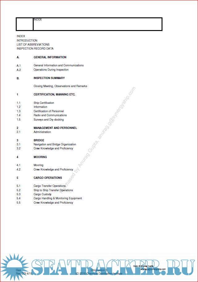 Year: 2015 (Updated in 2017) Language: english Author: OCIMF Genre: Handbook Publisher: CDI Edition: 8th Format: PDF Quality: eBook Pages count: 147 Description: This Ship Inspection Report (SIR) was developed as part of the CEFIC “Safety and Quality Assessment System for the Management of Ship Operations”. The document was transferred to CDI for global application and implementation across the world fleet of Chemical and LPG tankers. For assessment purposes, the SIR should be read in conjunction with the current version of the Vessel Particulars Questionnaire (VPQ). The aim of the SIR is to give an accurate assessment of the ship at the time the inspection is carried out. The SIR is essentially a quality assessment of the ship, its operations and personnel which also incorporates essential aspects of safety and environmental protection. Compliance with statutory, recommended and desirable items is identified within the SIR. Observations to all negative answers are listed in Section B (Inspection Summary). The Inspector may additionally remark on any answer or section deserving further expansion and on any conditions or occurrences observed during the inspection which were contrary to safe working practices. Inspectors are encouraged to document positive items and best practices that are noted on board, as well as items that have been corrected prior to completion of the inspection. Additional info: https://www.cdim.org/webshop/cdi/fr_cdim.jsp