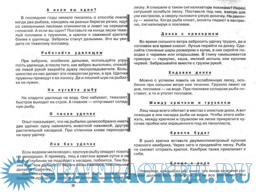 Год выпуска: 1999 Язык: русский Автор: В.Макеев Жанр: Справочное издание Издательство: Терра Спорт ISBN: 5-93127-014-0 Формат: PDF Качество: Отсканированные страницы Количество страниц: 83 Описание: В книге собраны советы опытного рыболова по разным видам летней и зимней рыбалки. По характеру книга является справочником, содержащим емкие советы: как выбрать и оснастить удилище, приготовить насадку и подкормку, где найти естественную наживку и как ее сохранить, где искать и ловить рыбу. В книге содержится более трехсот советов по рыбалке и оборудованию снастей, необходимых и начинающему, и опытному рыболову. Во второй части приведены рецепты приготовления рыбных блюд в домашних и походных условиях.