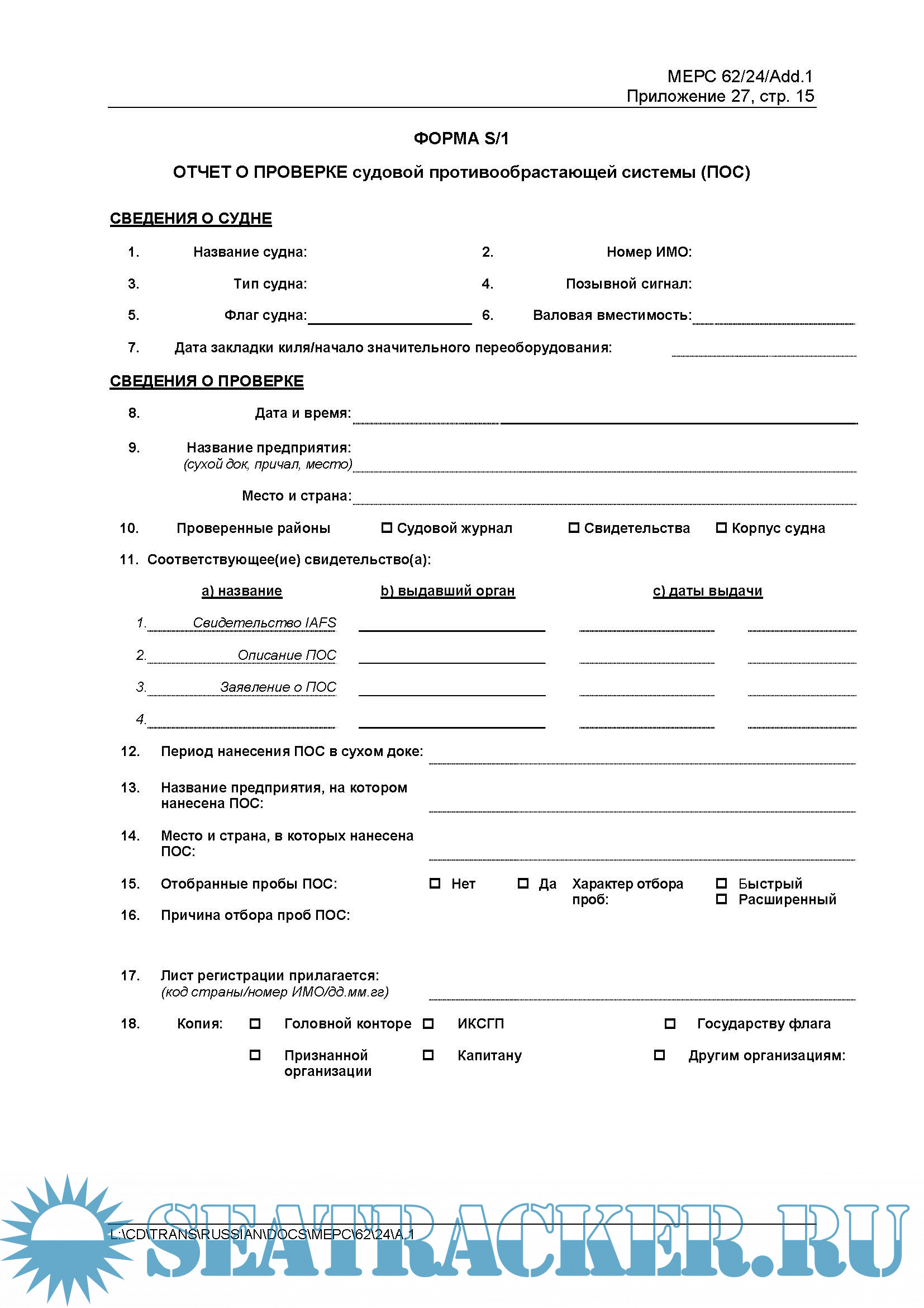 – Форма Журнала проверок биообрастания