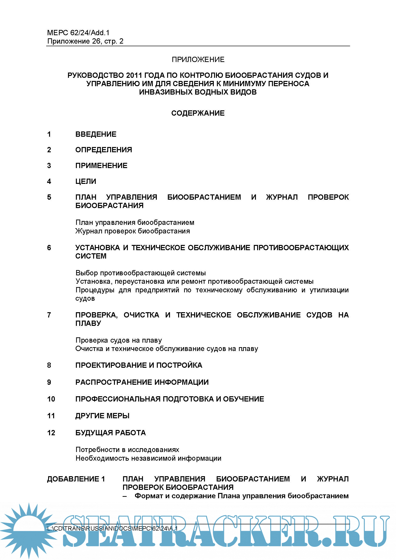 ДОБАВЛЕНИЕ 1 ПЛАН УПРАВЛЕНИЯ БИООБРАСТАНИЕМ И ЖУРНАЛ ПРОВЕРОК БИООБРАСТАНИЯ