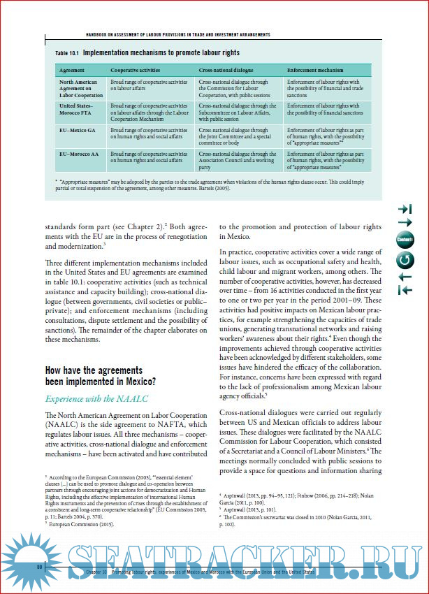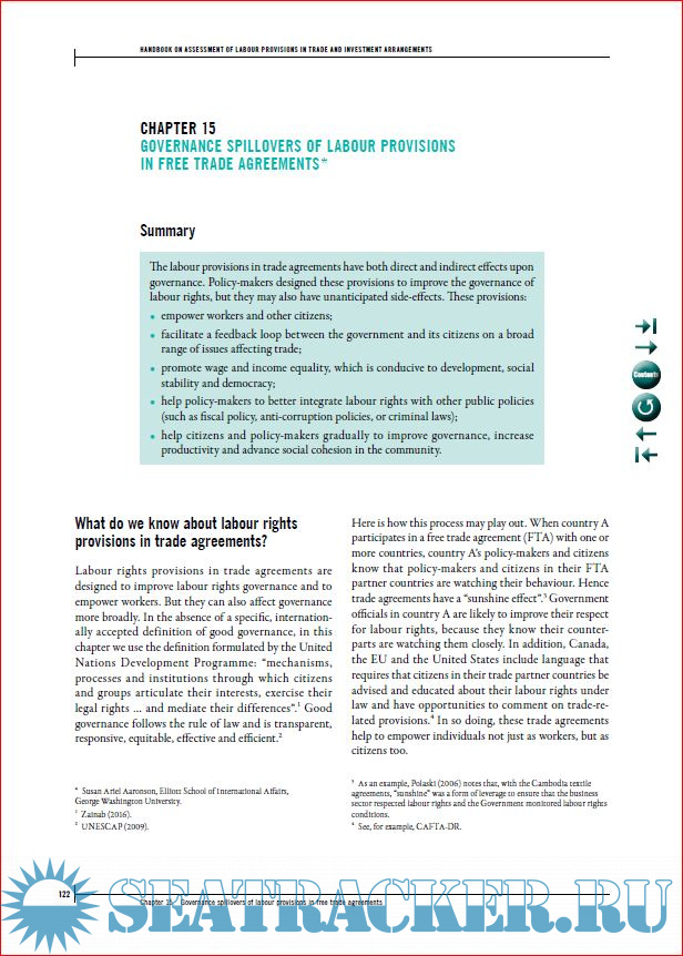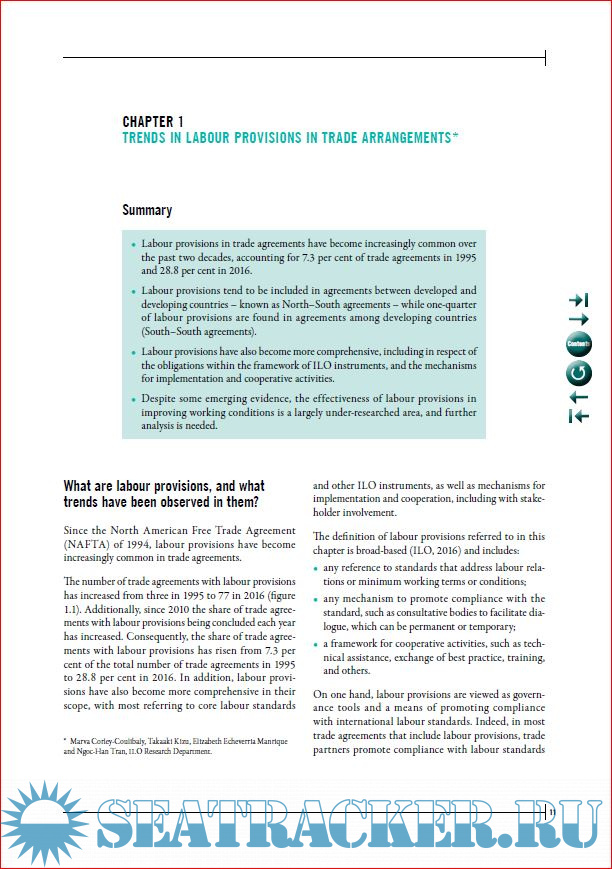 Year: 2017 Language: english Author: ILO Genre: Handbook Publisher: International Labour Organization Edition: 1st ISBN: 978-92-2-130342-8 Format: PDF Quality: eBook Pages count: 130 Description: This publication provides a short analysis on the design, scope, implementation and effectiveness of labour provisions in a practical and accessible manner. Labour provisions have become more commonplace in trade agreements and increasingly comprehensive in their scope. The Handbook provides practical information in a format geared towards non-specialist audiences focusing on different approaches regarding the content and implementation mechanisms of labour provisions (including technical cooperation and dialogue). In this regard, the Handbook presents different case-studies, with particular focus on implementation of the labour provisions, specific effects, and challenges. Particularly, it emphasizes the importance of stakeholders’ involvement in the implementation of the provisions. In addition, the Handbook explores other areas related to trade and labour, such as global supply chains, corporate social responsibility provisions in trade agreements and gender considerations.
