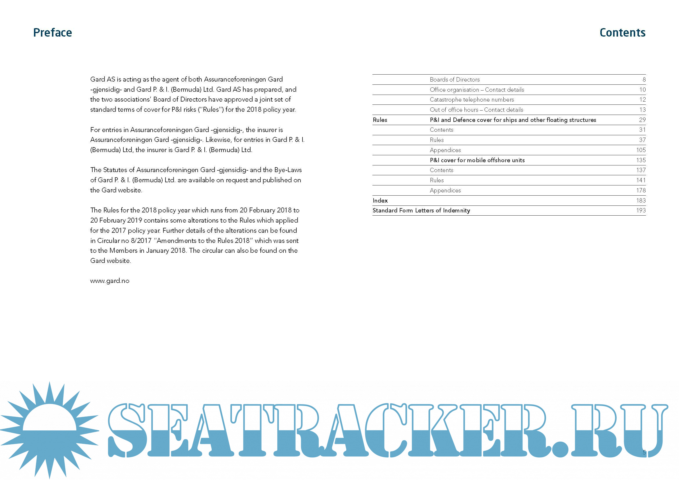 Year: 2018 Language: english Author: Gard P&I Genre: Handbook Format: PDF Quality: eBook Pages count: 111 Description: Gard AS is acting as the agent of both Assuranceforeningen Gard -gjensidig- and Gard P. & I. (Bermuda) Ltd. Gard AS has prepared, and the two associations’ Board of Directors have approved a joint set of standard terms of cover for P&I risks (“Rules”) for the 2018 policy year. For entries in Assuranceforeningen Gard -gjensidig-, the insurer is Assuranceforeningen Gard -gjensidig-. Likewise, for entries in Gard P. & I. (Bermuda) Ltd, the insurer is Gard P. & I. (Bermuda) Ltd. The Statutes of Assuranceforeningen Gard -gjensidig- and the Bye-Laws of Gard P. & I. (Bermuda) Ltd. are available on request and published on the Gard website. The Rules for the 2018 policy year which runs from 20 February 2018 to 20 February 2019 contains some alterations to the Rules which applied for the 2017 policy year. Further details of the alterations can be found in Circular no 8/2017 “Amendments to the Rules 2018” which was sent to the Members in January 2018. The circular can also be found on the Gard website.